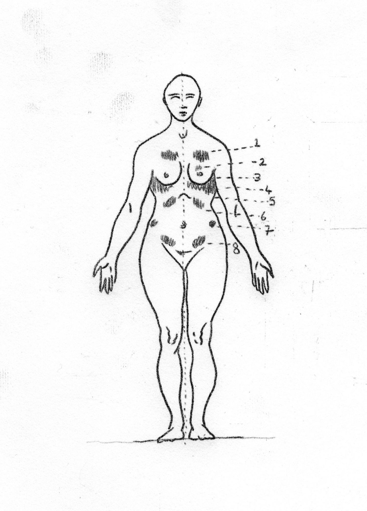 RW: I always describe an exhibition as an extension of my research notebooks. It’s predominantly photography—my own photographs as well as the found objects I cull from old medical textbooks, flea markets, eBay, or literally find on the street—but there are also drawings. Some of them are quite small, and some of them are large-scale murals I draw on the wall—very free drawings. I see them as my body’s response to the work, exploring the female form, but definitely not as a realistic rendering of the body.