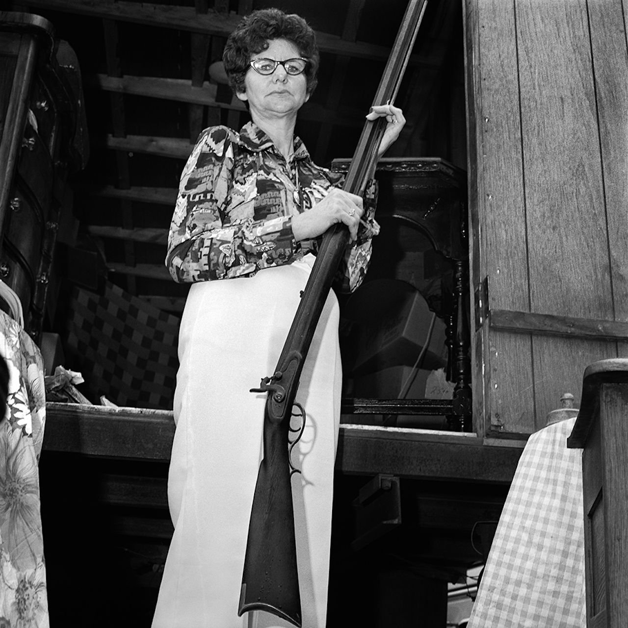 Most of Fox Solomon’s pictures seem diligent and fair, but unlike some of the artist’s more open-ended work, and unlike the work of Diane Arbus (to whom she is often compared), the pictures selected for Liberty Theater all seem to be saying something specific. In this case, it’s something about race and class in the South. It is as if each photograph is a symbol—sometimes crystal clear, like we see in an image of a black man, his face badly beaten. But then sometimes the message is abstract—a skinny white woman, mouth hanging open in suspicion, her dishwater-blonde hair in curlers. There’s a broken iron gate in front of a plantation house; a black couple standing straight as columns in their shipshape living room; black people with musical instruments, dressed in their best for church, fishing; and white people suntanning, getting highlights in their hair and smoking cigarettes at the beauty shop, holding guns, dressed in American Civil War garb playing with Confederate soldier figurines.