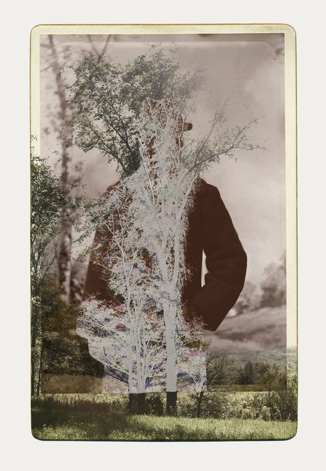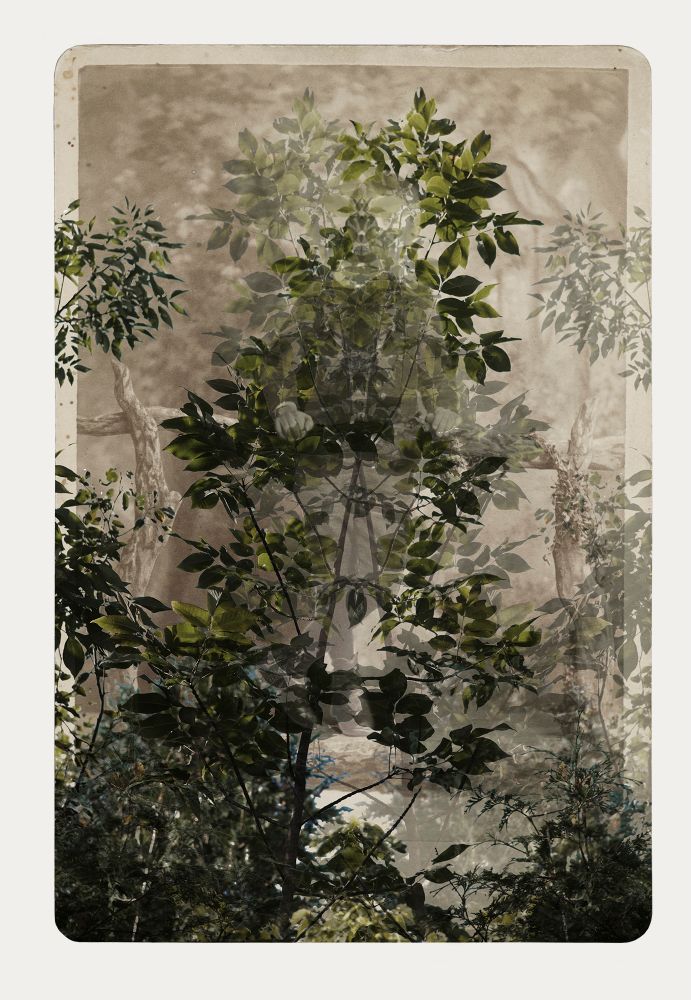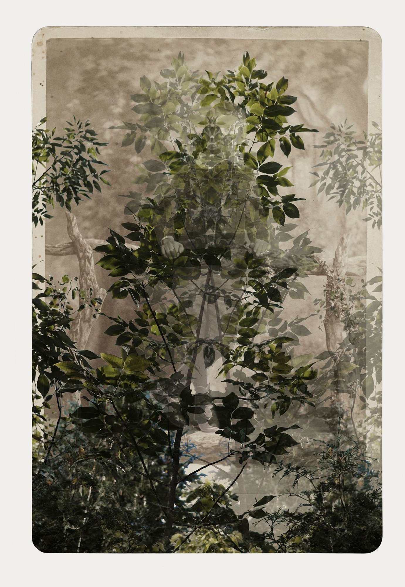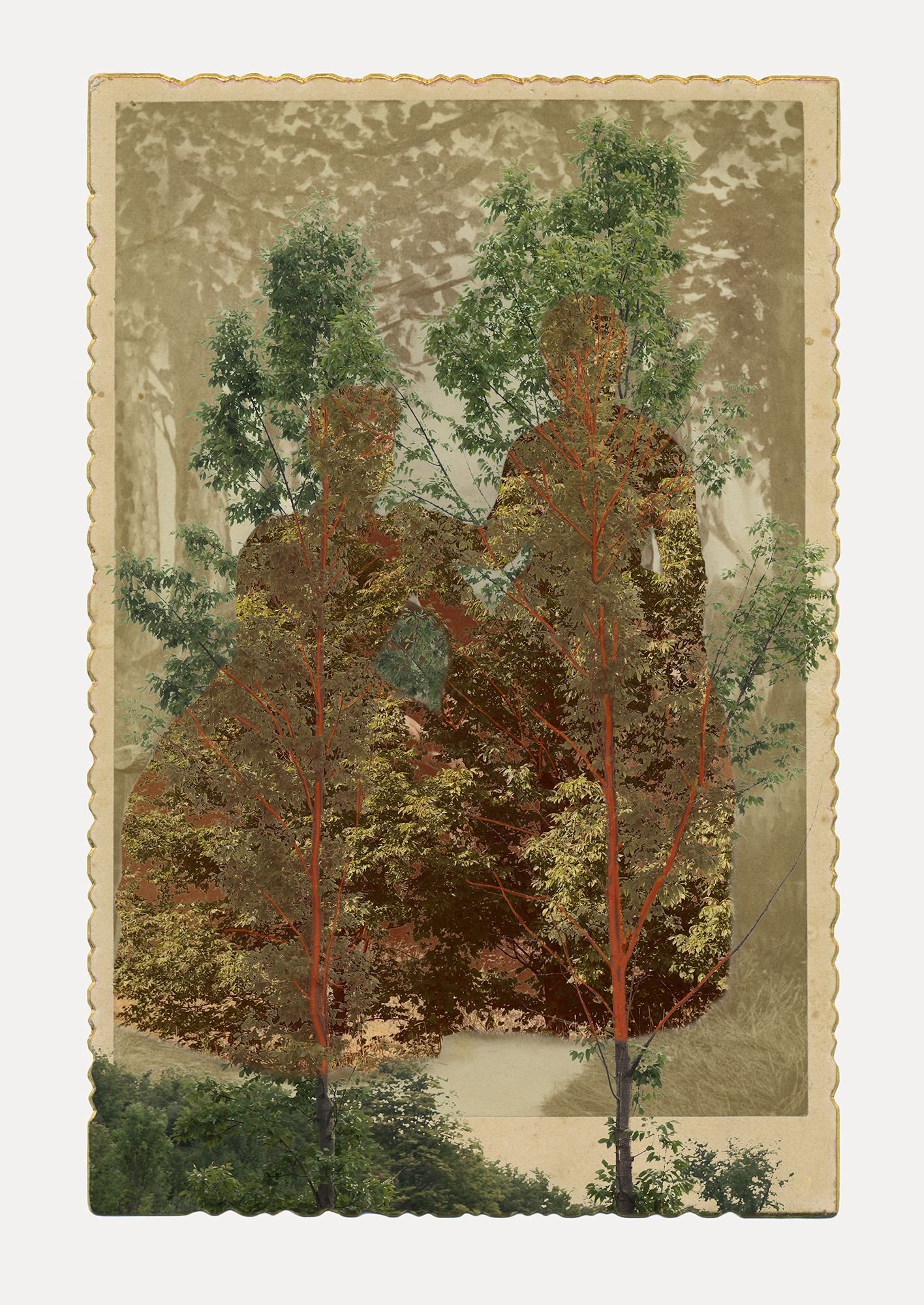 The series “Arboretum” features found nineteenth-century cabinet cards whose painted forest backdrops have been transformed to allow the trees to take over the figures. In so doing, the forest claims a position in the foreground of the picture as the main subject; the figure becomes the ground.