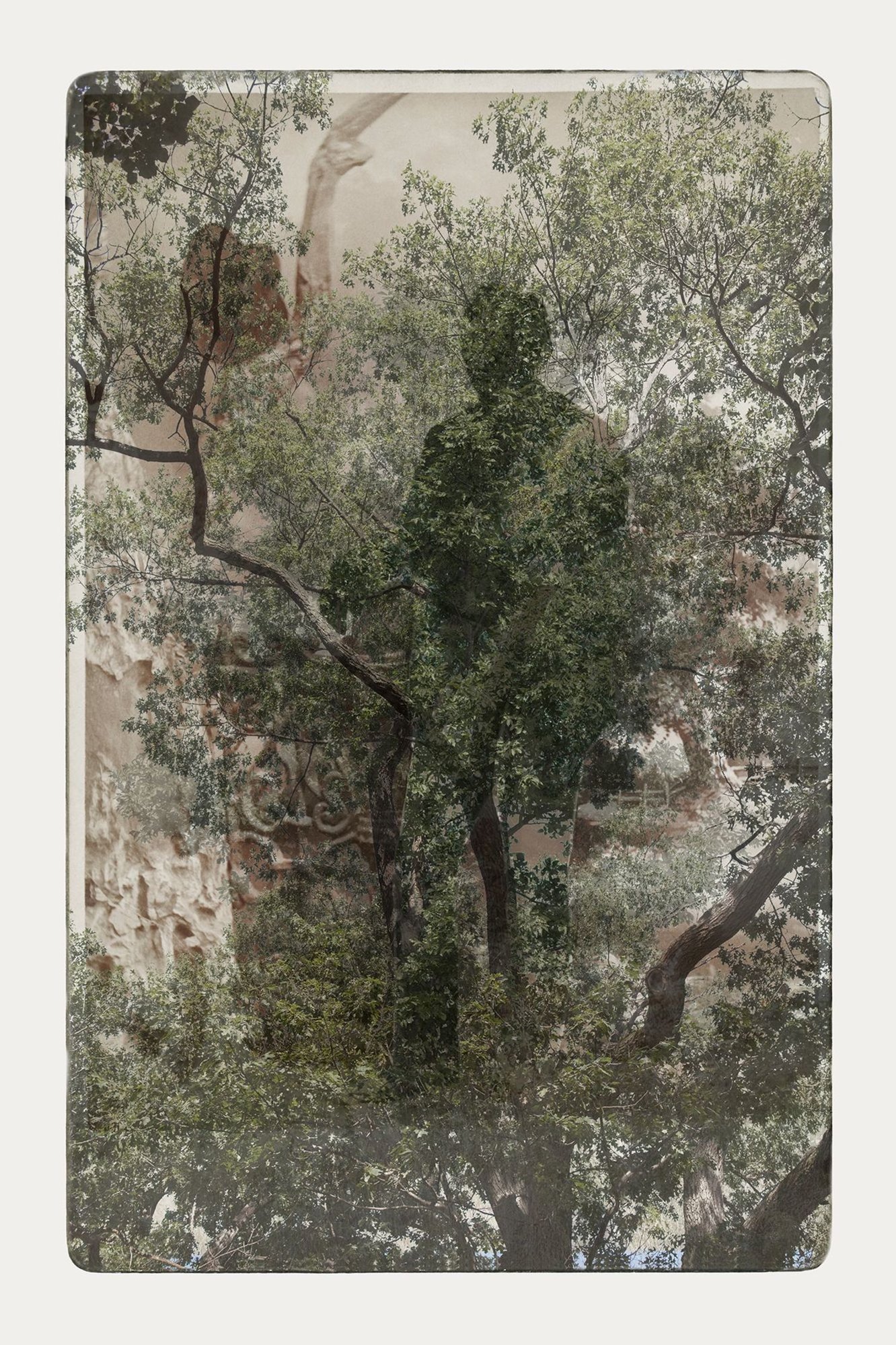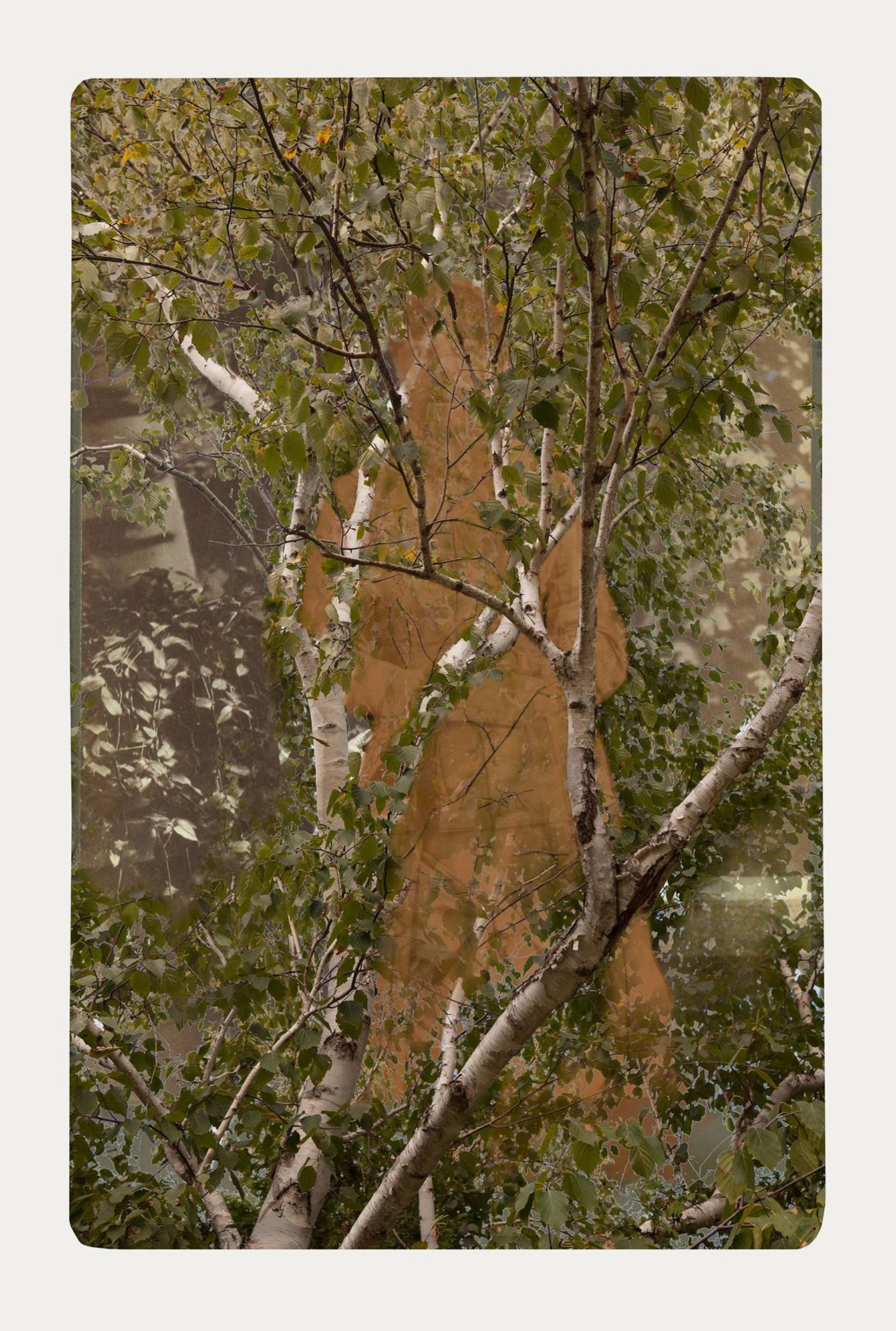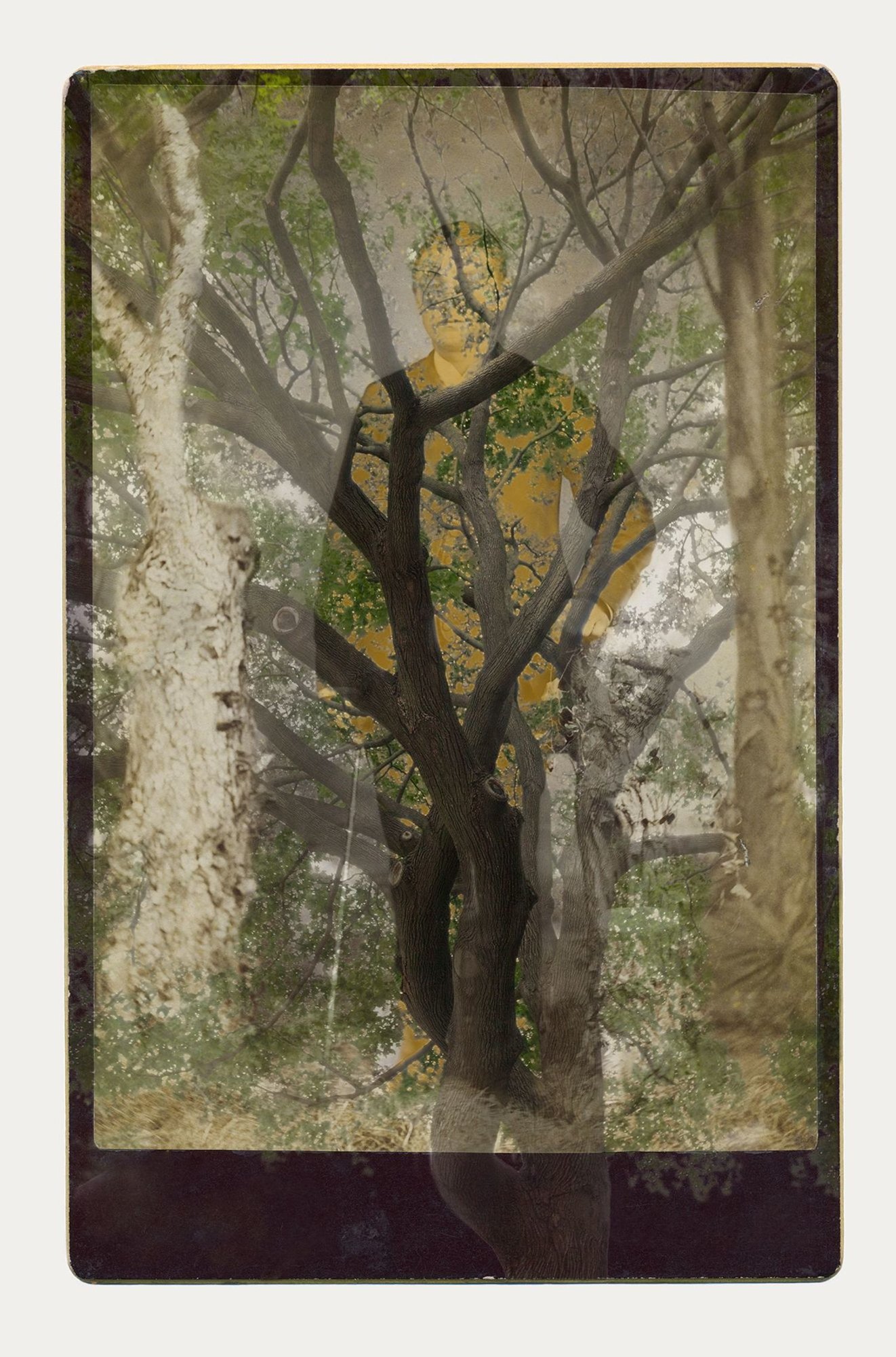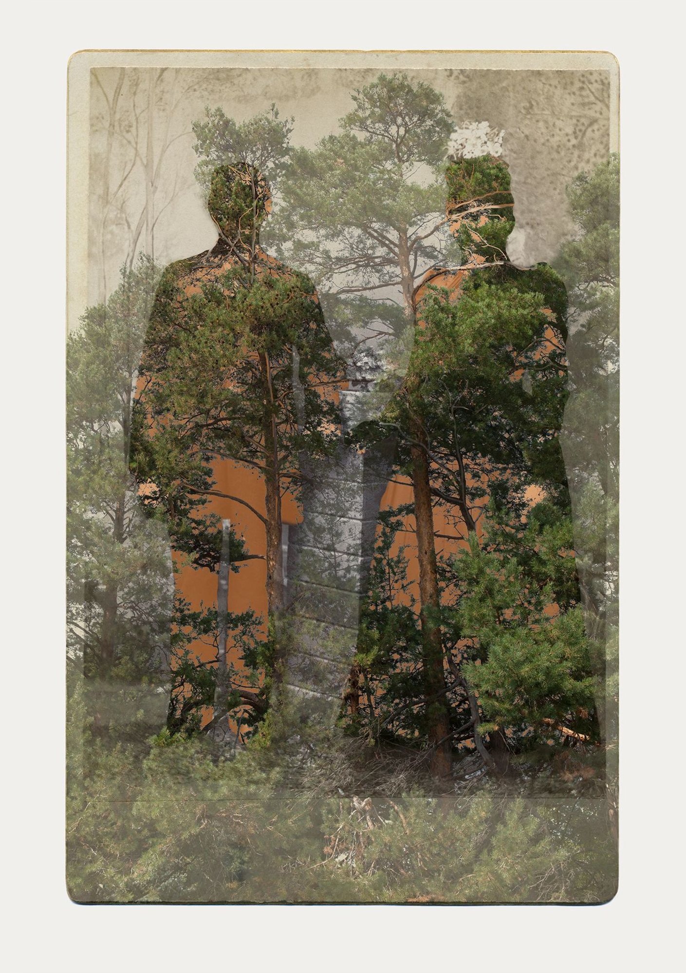 The series “Arboretum” features found nineteenth-century cabinet cards whose painted forest backdrops have been transformed to allow the trees to take over the figures. In so doing, the forest claims a position in the foreground of the picture as the main subject; the figure becomes the ground.