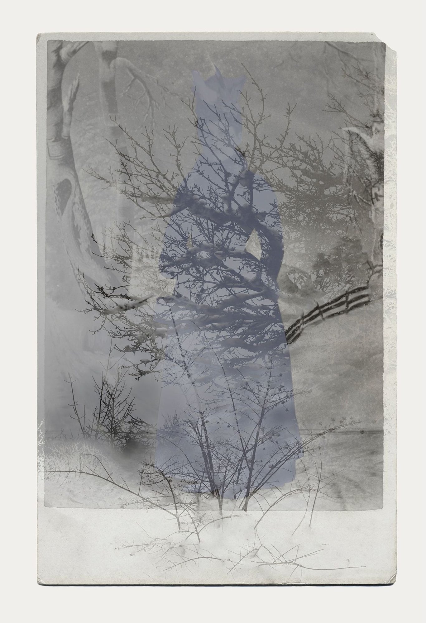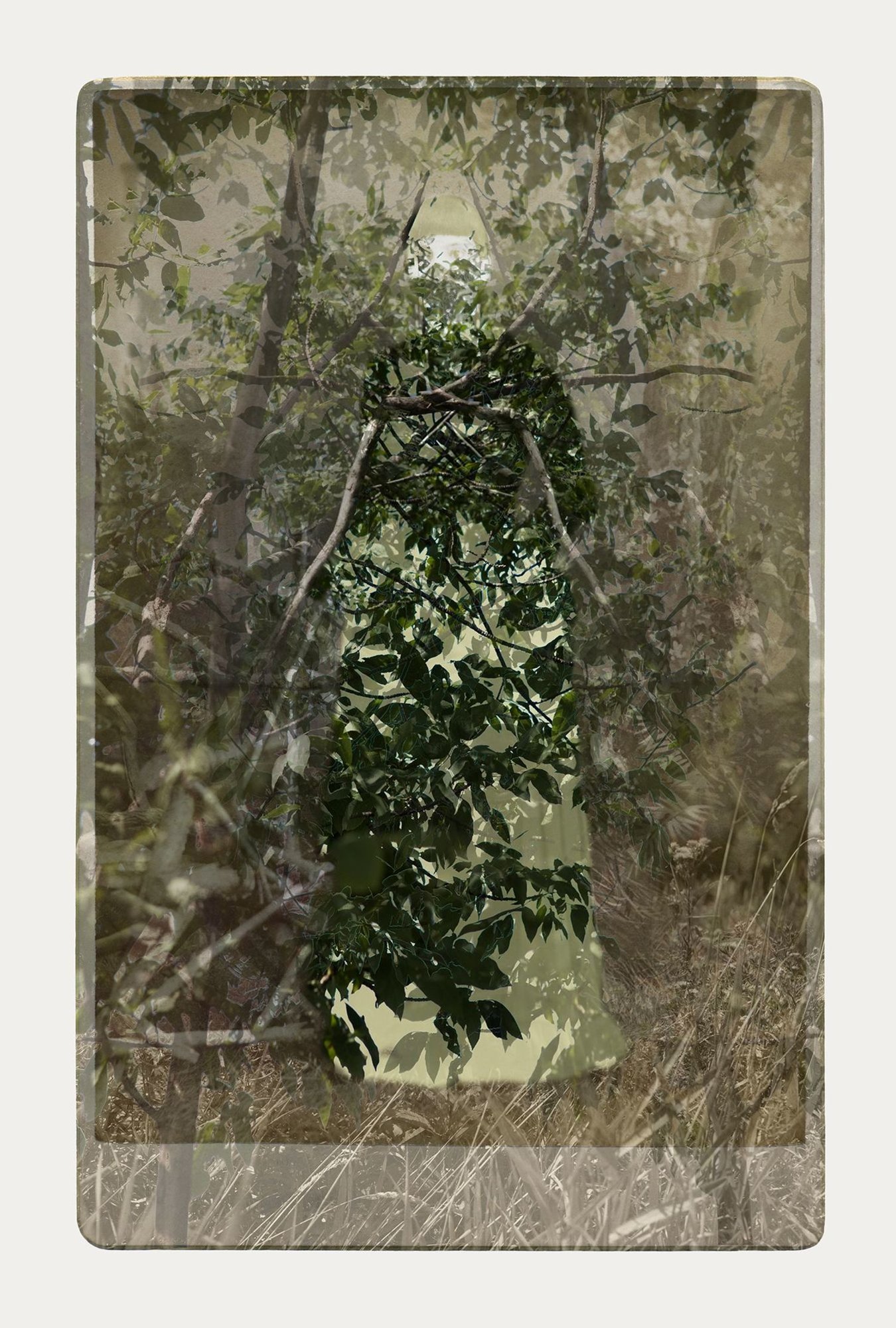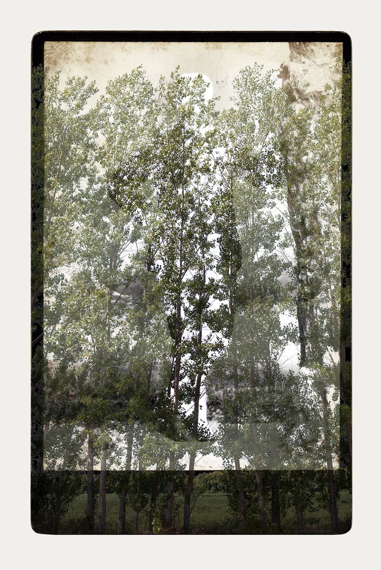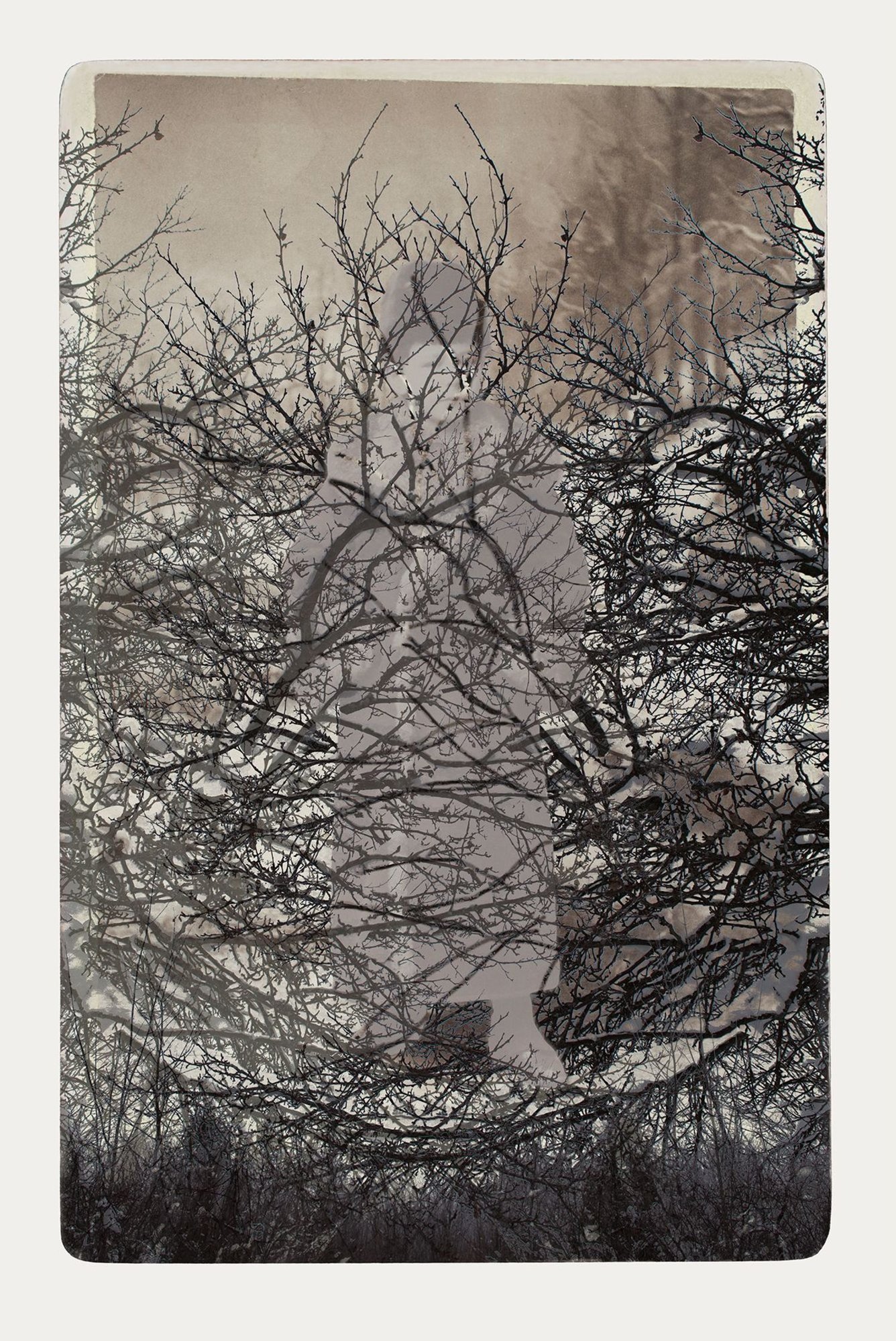The series “Arboretum” features found nineteenth-century cabinet cards whose painted forest backdrops have been transformed to allow the trees to take over the figures. In so doing, the forest claims a position in the foreground of the picture as the main subject; the figure becomes the ground.