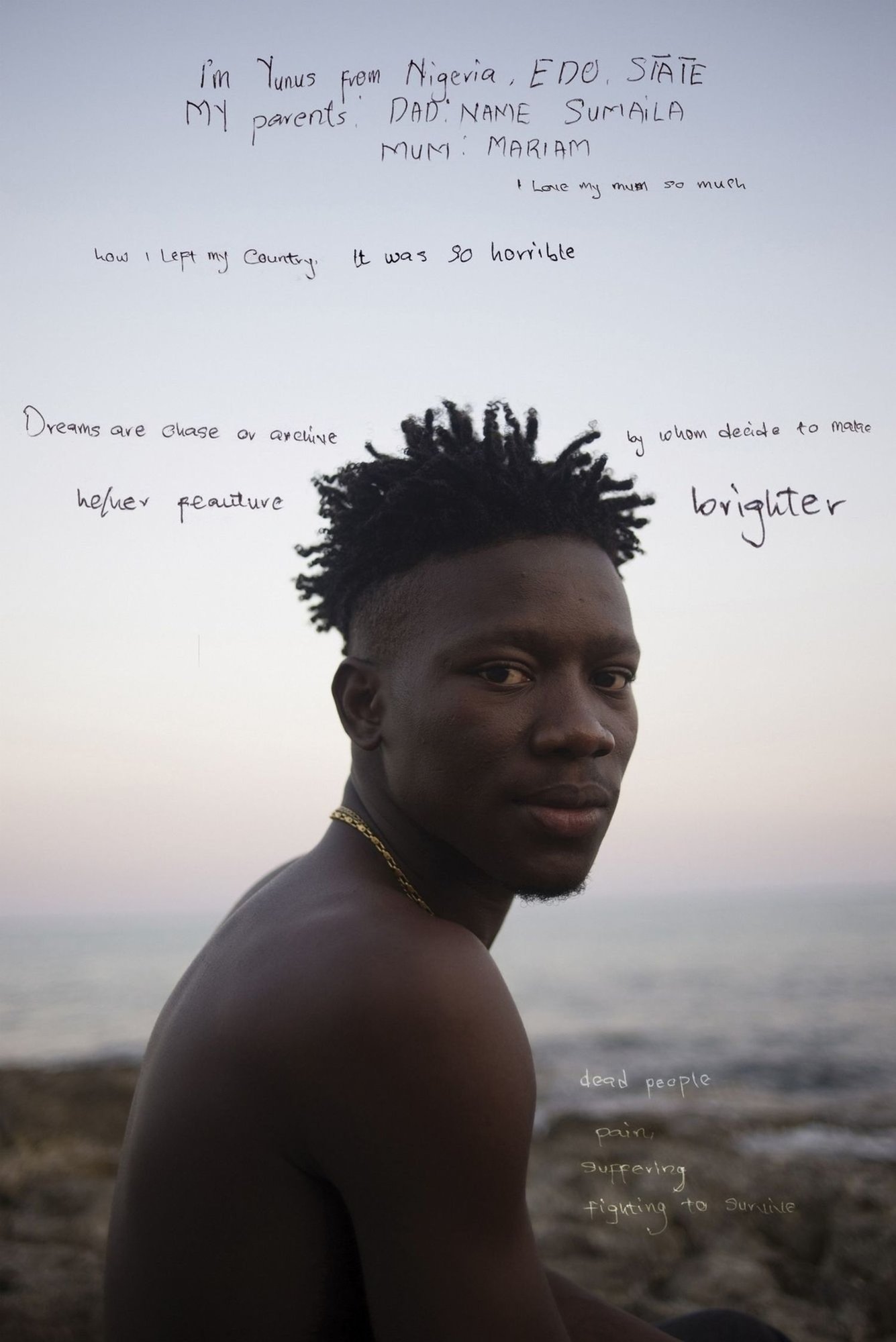 This project is about migrants’ feelings, tensions, inner conflicts, and the glimmer of identity that can be grasped during extreme circumstances. These are all elements that come into the light through portraiture, as well as the texts and drawings created by the subjects themselves. Their active participation has always been key to me, as it ideally stands as a reclamation of authorship over their own image.
