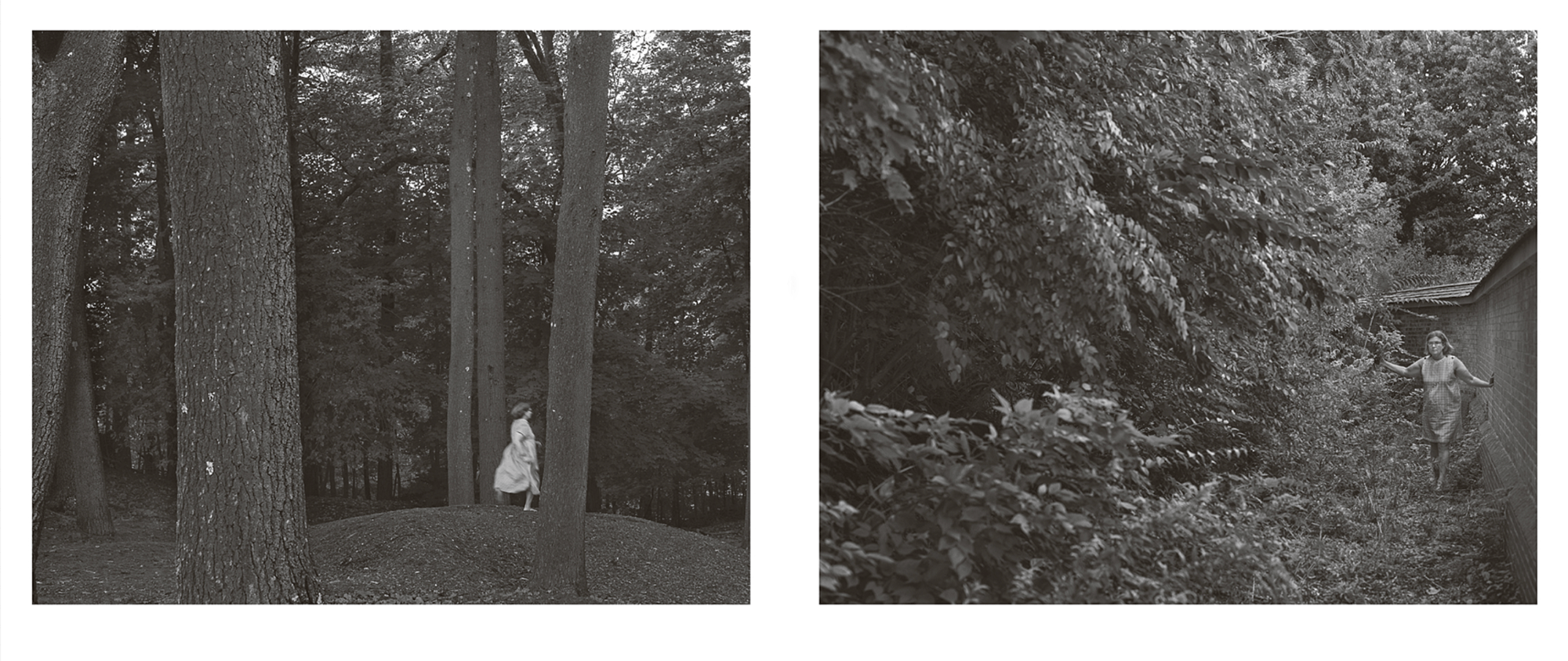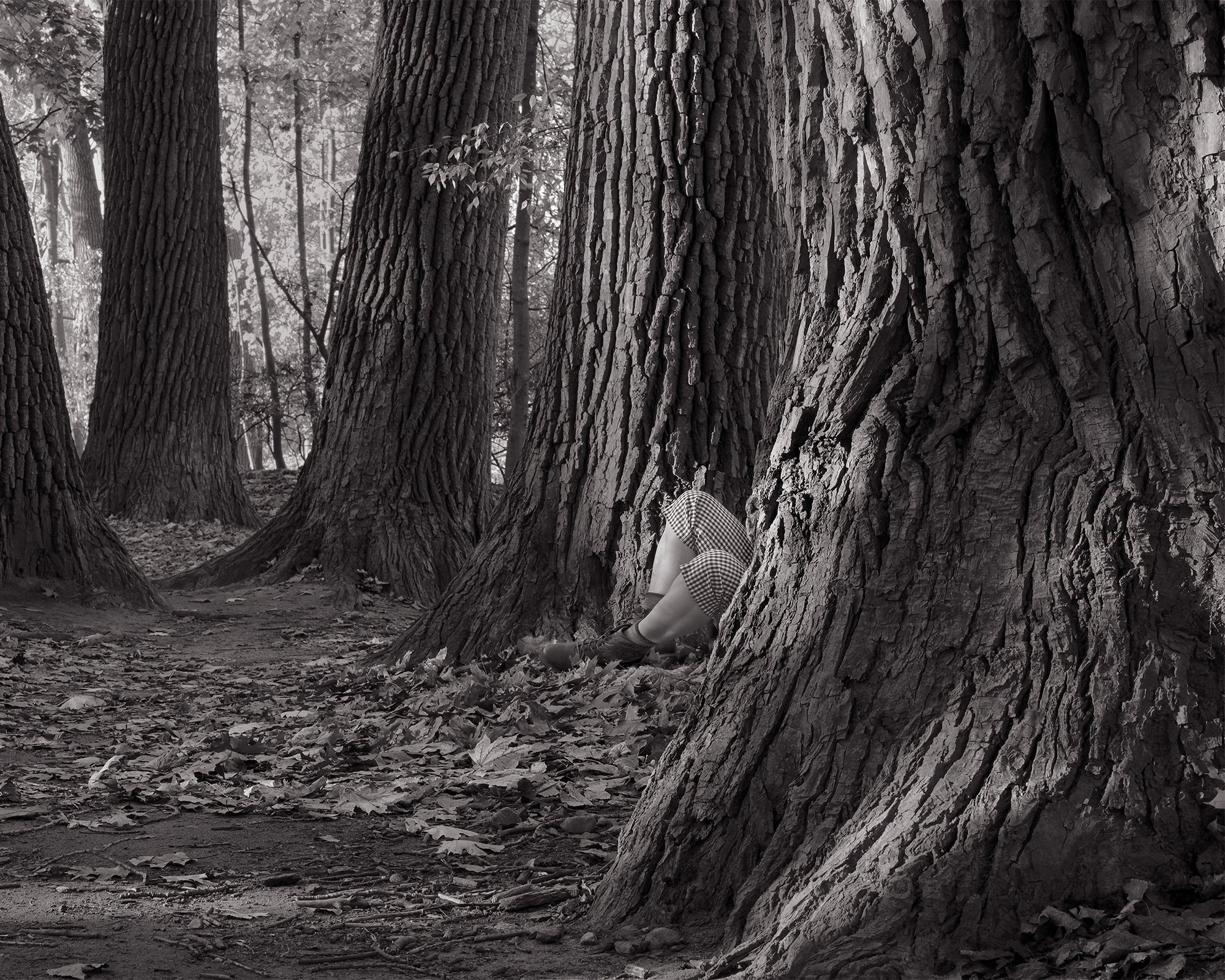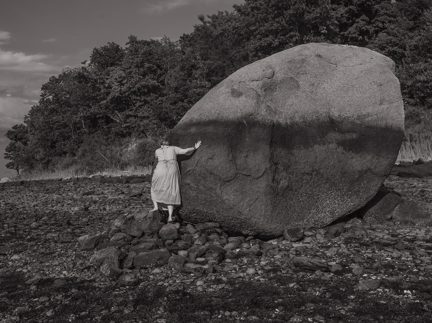 The photograph of Grace sitting under leaves was basically made by her. We were in a park and she saw these leaves that reminded her of Henri Rousseau and his paintings with small people in large vegetation. She decided to sit underneath them—which involved sitting in nettles by the way, so it was a difficult experience. She pulled down her top and said “take the photograph.” I took the one by the rock.