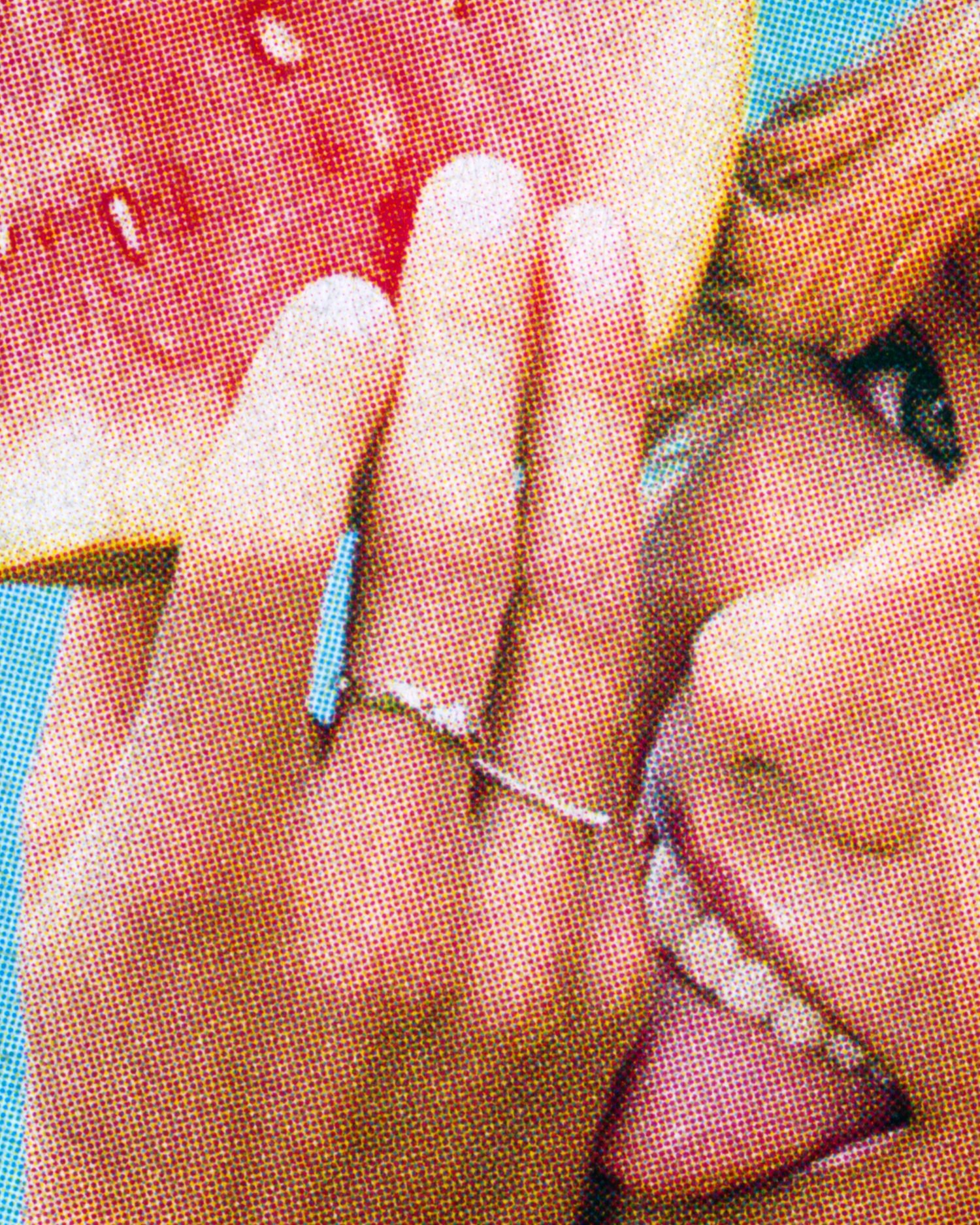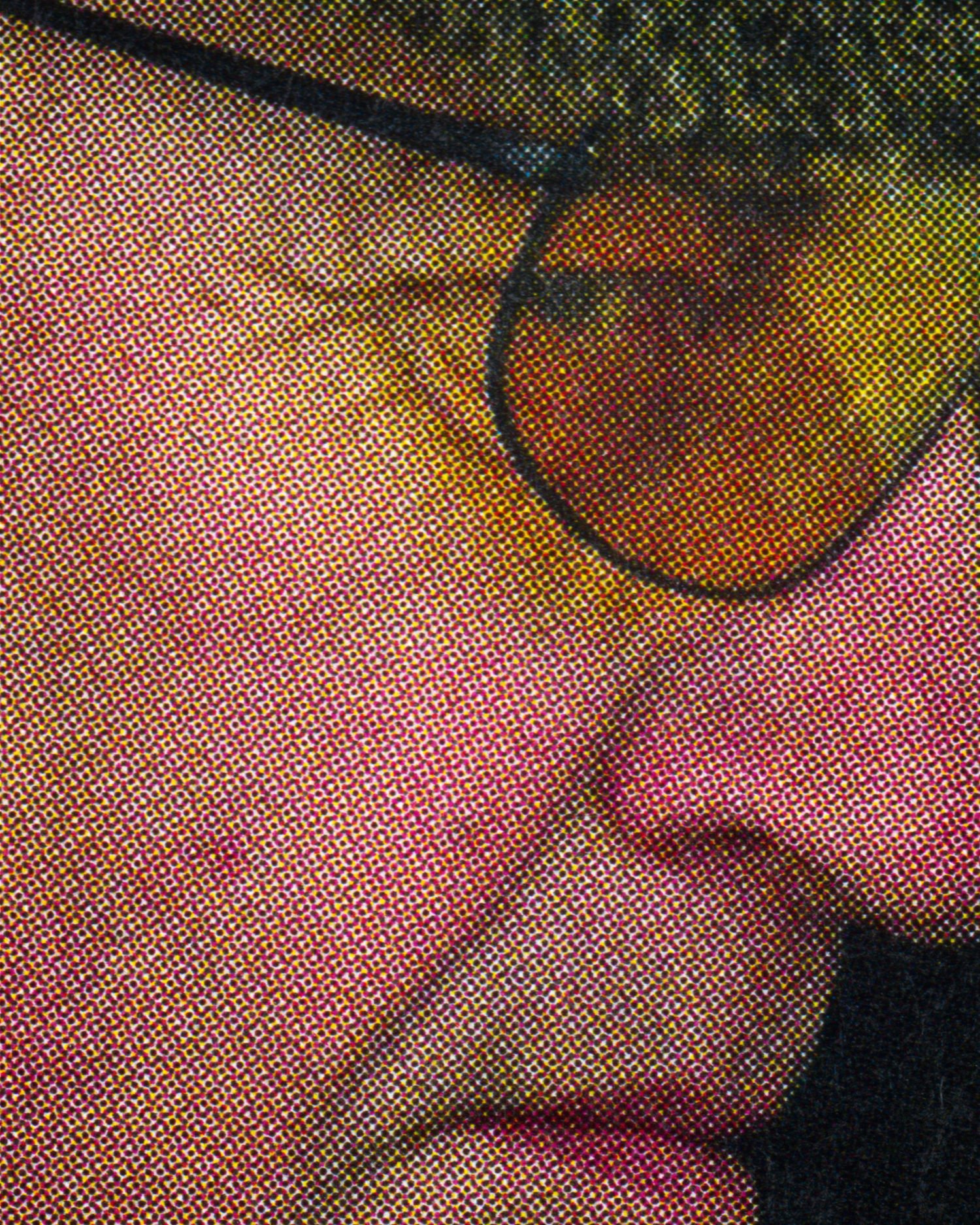 In the fourth chapter, Reading Room, the book takes a turn. We move away from the neighborhood and into something more visceral. The paper stock changes to one with an old textured magazine quality, the crops become tight, the colors are louder, close-up photographs of plants frame a section of halftone advertisement images. We are given the distractions of guns, ammo, and Playboy. Much like the heavenly bamboo, the fish lure, the bullets, and the blaring color that appears here, we are presented with seductive optics that distract from their true nature.
