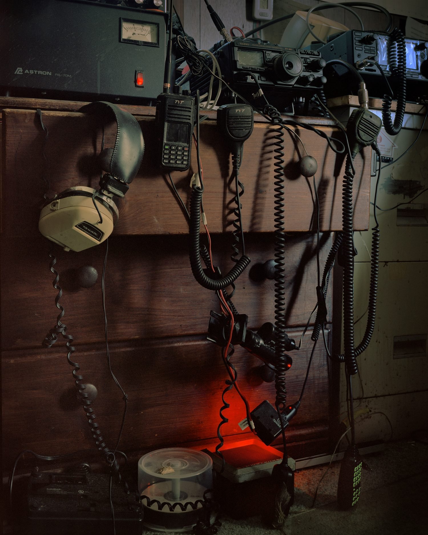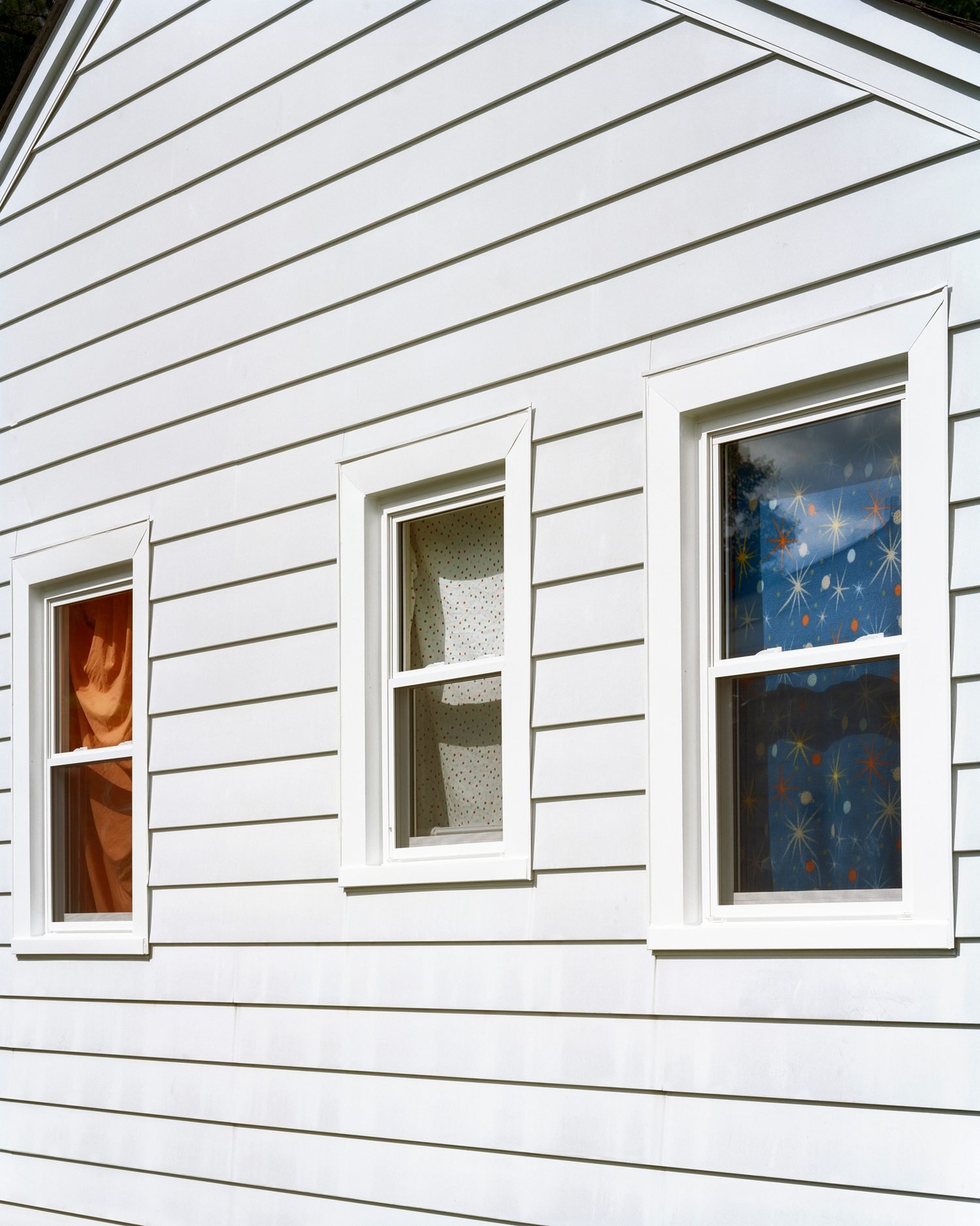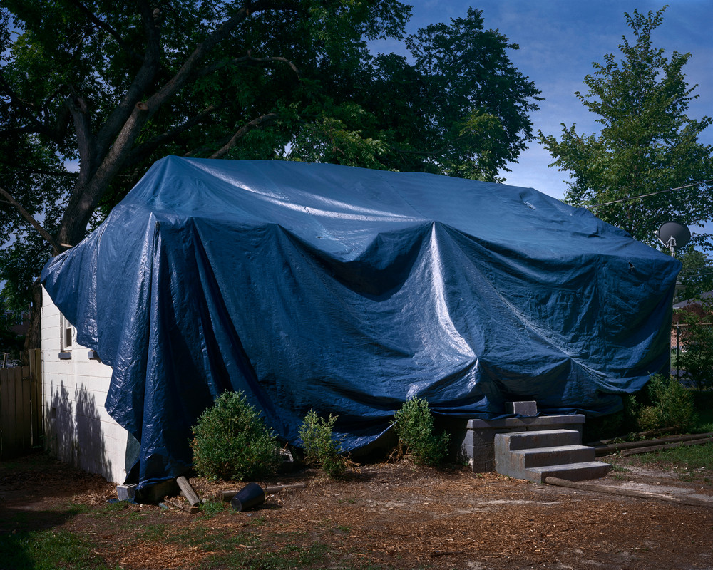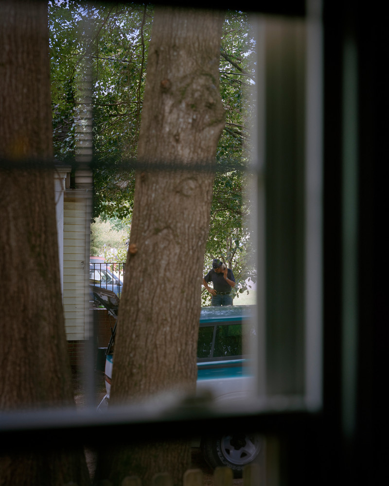 The connection of the starling to the violence of European colonists is hard to miss. In the second, Trespass, we begin to see the town. A monumental blue tarped house looms across a full spread, men are photographed alone, crowded interiors are on view. The photographs in the final chapter, Neighbors, are taken from afar or looking out of windows, as if stepping back. The chapter names give small clues; oughnum is the indigenous Chickahominy people’s word for good hunting land, antinomy is a paradox or a contradiction.