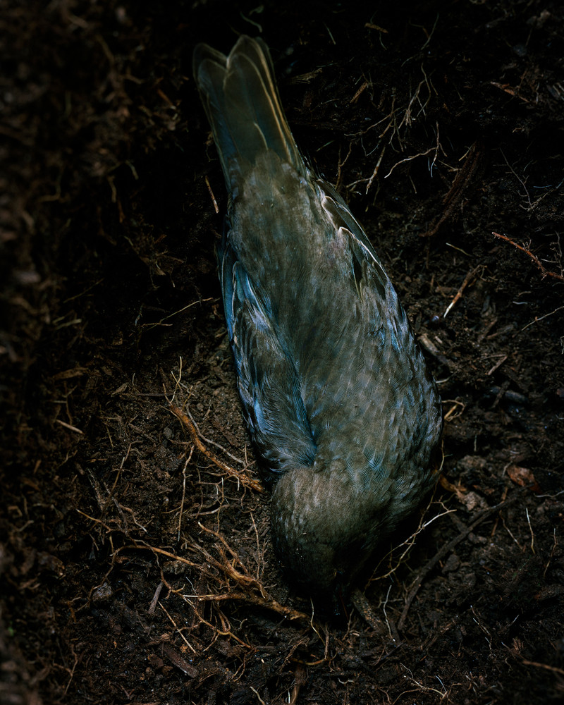 Scientific studies consider murmurations to be similar to avalanches, crystal formation, and liquids turning to gas, all systems termed ‘on the edge.’ Rocheleau watched as the 2016 election broke down any form of restraint holding the country’s worst impulses in check. His neighborhood changed in the time that he photographed the project. The book reflects this as it moves along. But the artist believes that “there’s a possibility for redemption, true community, and love with an honest reckoning.” He speaks about radical empathy. And so the book closes with a postscript titled Funeral for a European Starling. In a small act of love, an injured bird found in the road, given comfort in its last moments.
