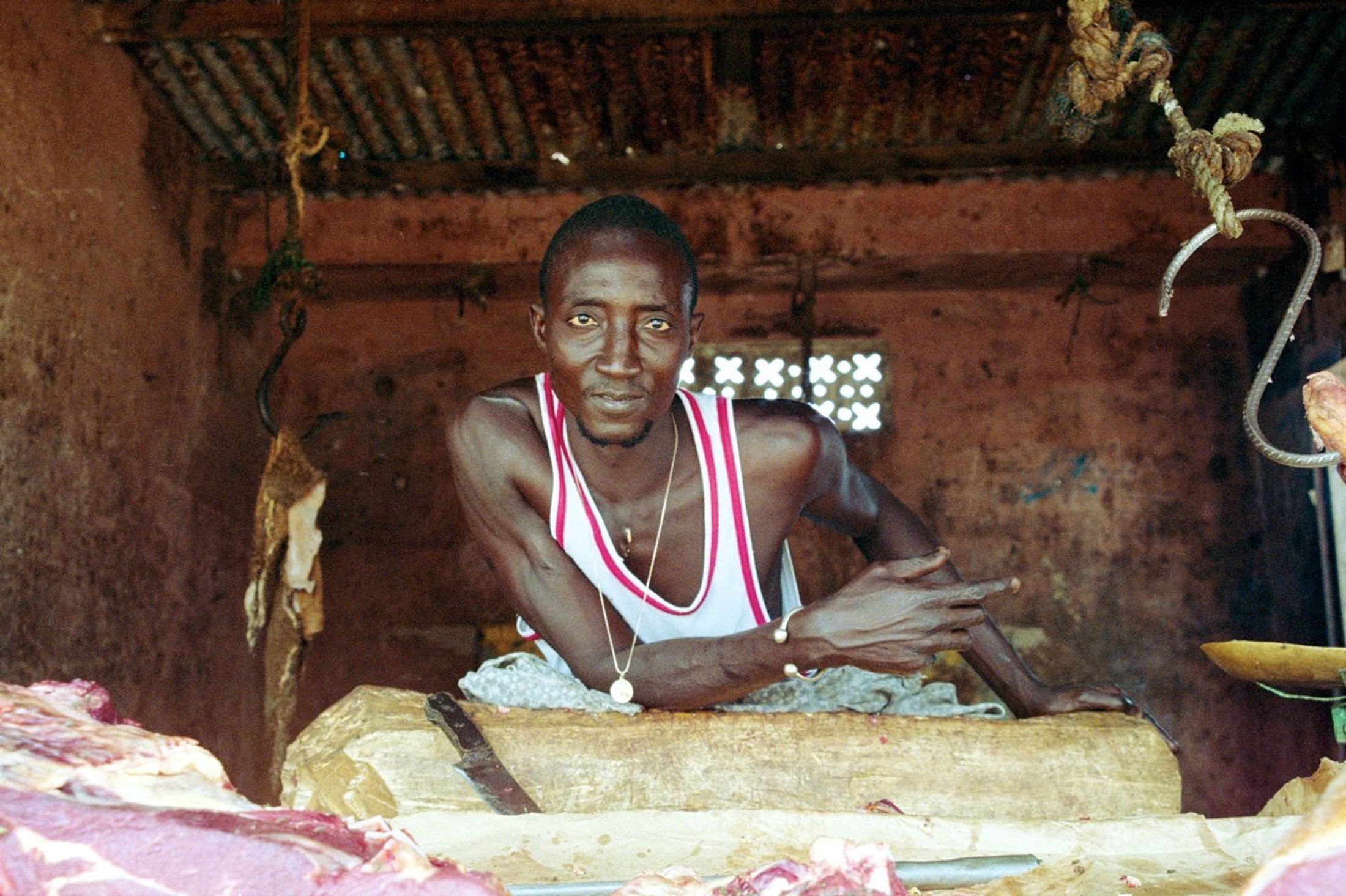 Although he lives in an outlying suburb, and enjoys a much more traditional life than his counterparts who live or work in central Dakar, this butcher's old school style looks like it might have been lifted directly from an early 1980s music video. © Sharon Schoen