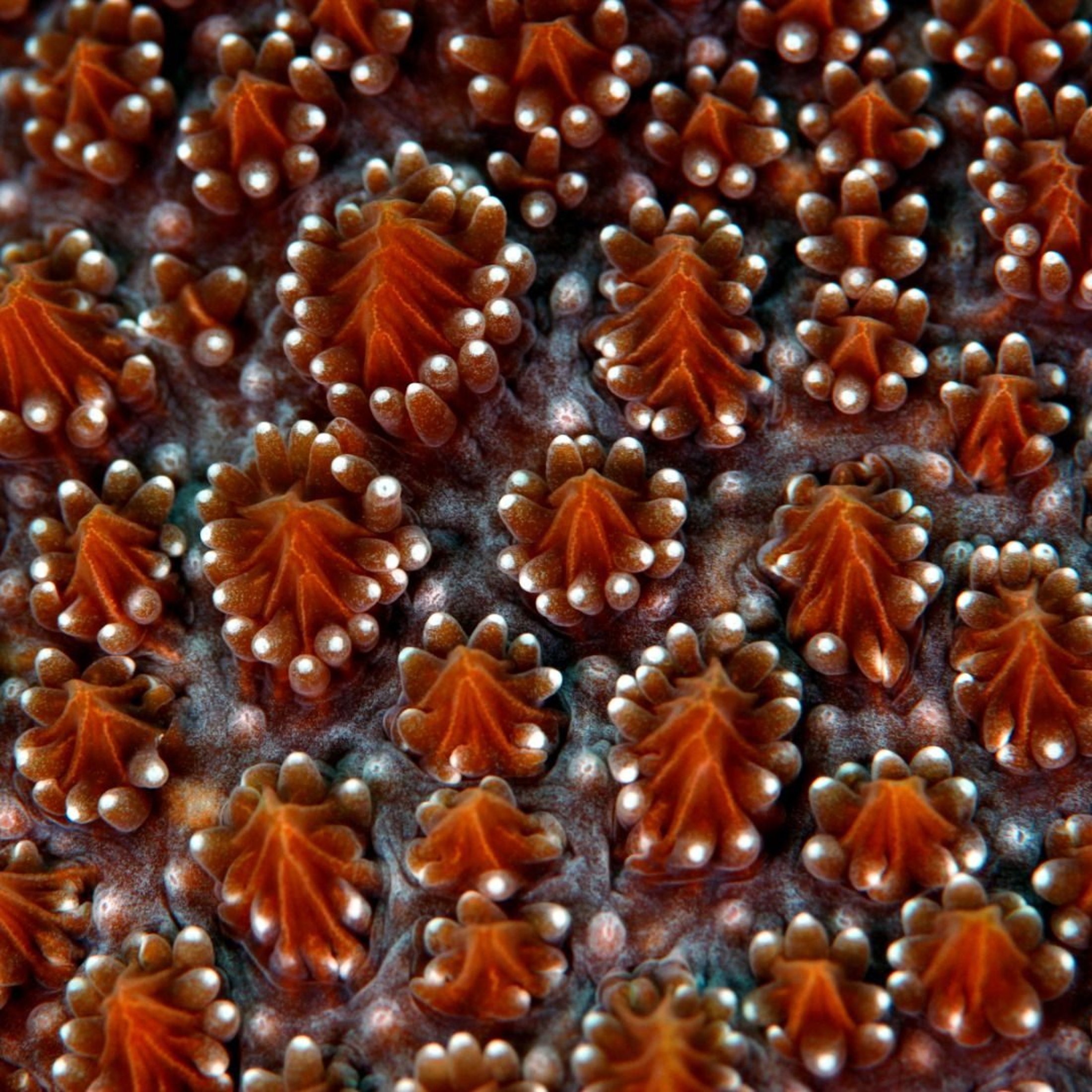 “My Life Aquatic” shows a series of very diverse hard coral close-ups. Every photograph reveals a fascinating, colorful graphical pattern, which is in fact a colony of tiny little living organisms.