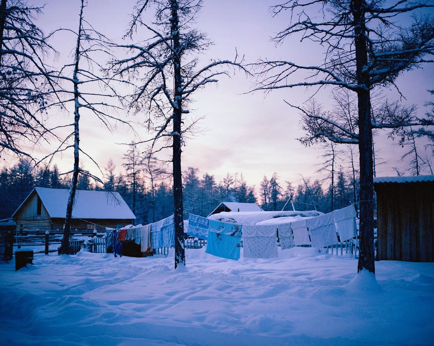 During this period of complete darkness, Northern Russia operates within a balance of extremes, including intense weather conditions that make operating photographic equipment a difficult task. So, Roberts made each photograph with a medium-format camera, using film reinforced with paper to save it from becoming brittle and cracking in the freezing temperatures. Reflecting on this process, he explains, “Using digital would have been impractical due to the cold temperatures that drain the camera batteries very quickly. The temperature averaged -25 degrees Celsius, but with wind chill it often got down to below -30. I found working in these temperatures very challenging—but also invigorating. Most of the time I could only spend about 30 minutes outside before all feeling in my fingers and toes disappeared, which is particularly difficult when you’re trying to operate a tripod and change film in the camera!”