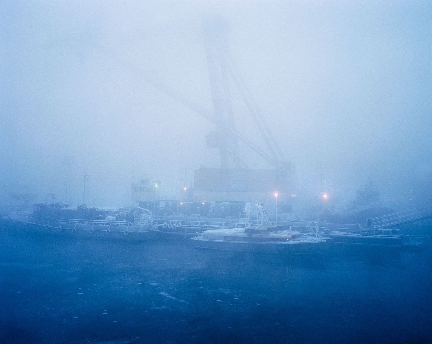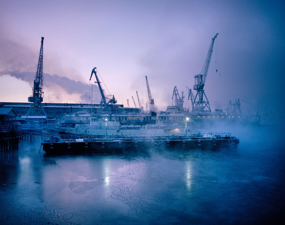 While Roberts was already well-versed in manual photography before reaching the Kola Peninsula, what struck him most was the colour palette that came to define the images. “The extent of the blue hue was something that surprised me when I received the contact sheets after processing the film in Moscow a couple of months later. I decided to embrace this colour effect for the final series.” The resulting pictures in his series transport us to expansive scenes of industrial and residential landscapes, with buildings and machinery encrusted in frost, all blanketed in the striking cool blue of perpetual dusk. This combination of ice and ethereal lighting defines the crisp intricacy and detail in the subjects, unified by tones that hover between magenta and midnight blue.