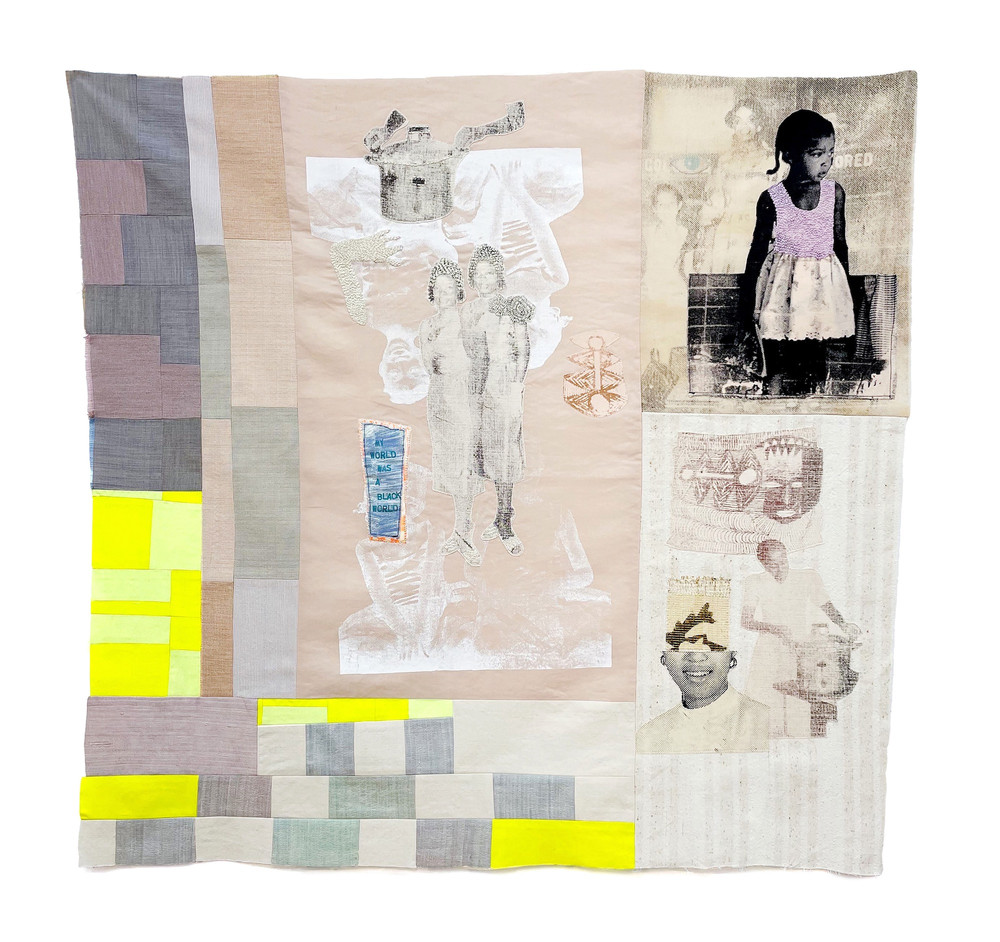 Beginning in 2022, Stephanie Santana’s ongoing project The Wayfinding Series honors Black women as “wayfinders, planners, strategists, timeline jumpers and archivists.” It incorporates photographic images, improvisational printmaking, quilting, and embroidery in prints and textile works that honor the roles and experiences of Black women, reflecting the richness and complexity of their lives and identities.