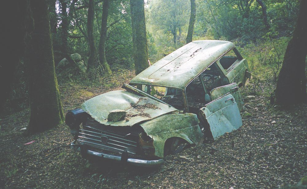 It all becomes clear in the opening pair of story and photograph. The text begins: “What can I tell you about this photograph? I took it in Corsica in 2002, 25 April. Wendy and I had gone on a long walk and got completely lost. As we tried to guess our way back to the path we chanced across this abandoned car. The light was just perfect so I took a quick photograph and we carried on, wondering about what might have happened and how it ended up as lost as we were, miles from any road. A few minutes later we bumped into a young girl and a much older man…”