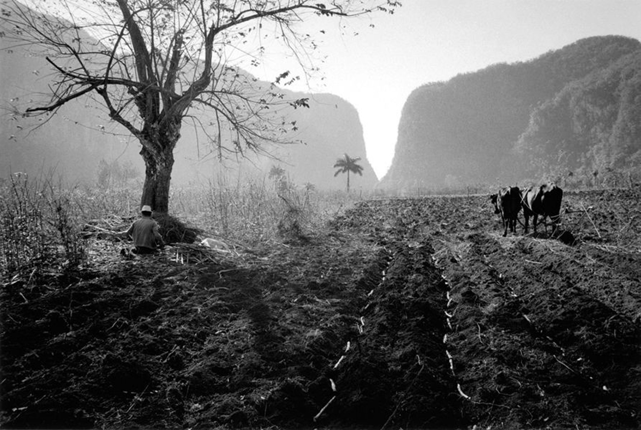 One of the most enigmatic photographs depicts what seems to be a person carrying a pole filled with hanging tobacco leaves, a setup that Cubans call a cuje. Interestingly, though, the photograph offers no clues to confirm that the subject is indeed a person. The leaves could just as well be supported by any other object, shaped like this mysterious figure, alone in the middle of the field.