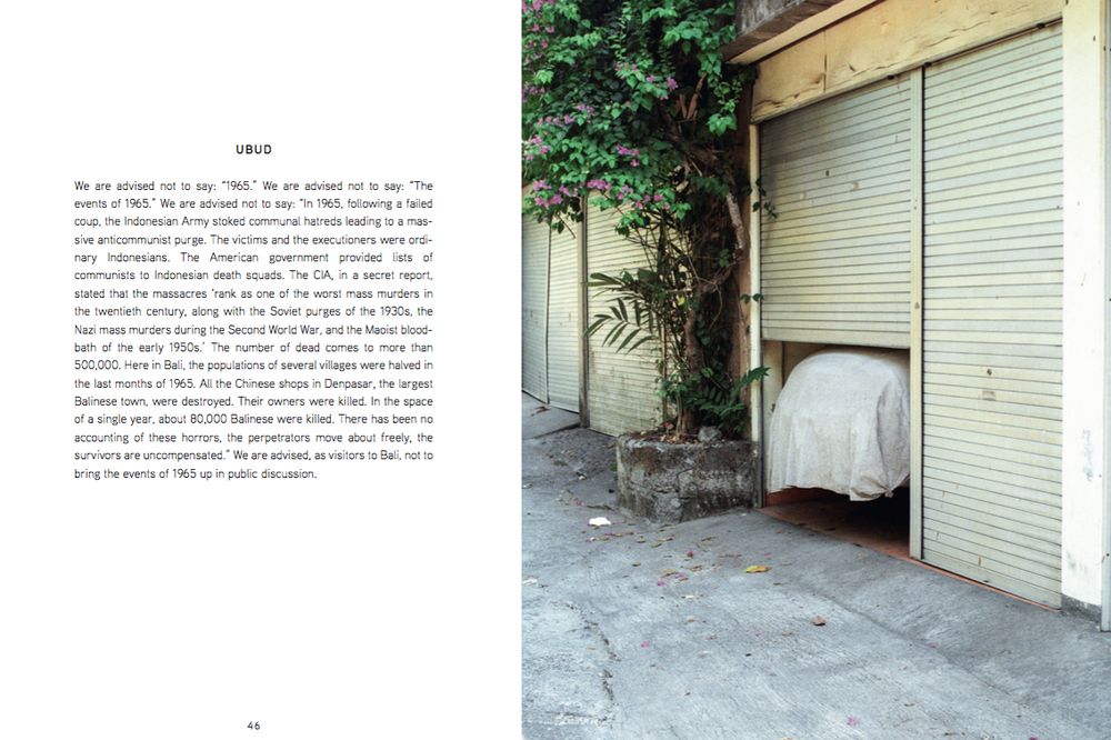 In Blind Spot, instants, prized off from time, enter into complicity with memory, history and social thought. Things seen corroborate with things known. The tarp concealing a construction scaffold in Berlin speaks of ISIS soldiers and Guantanamo’s prison jumpsuits, while a nearby construction site on Niederkirchnerstrasse recalls the location of the former headquarters of Gestapo and the SS. In modern-day Bali, the back of a car draped by cloth becomes a silent metonymy, both for the mass murder of over 500,000 Indonesian communists in the mid-60s and for the limits of vision. A ship’s stack in Brienzersee resounds with the final movement of Brahms’ First Symphony. Two cable conduits in Rhinecliff, New York, eulogize the “bipedal grace” of Seamus Heaney’s poetry. Urban contingency speaks on behalf of the dead.