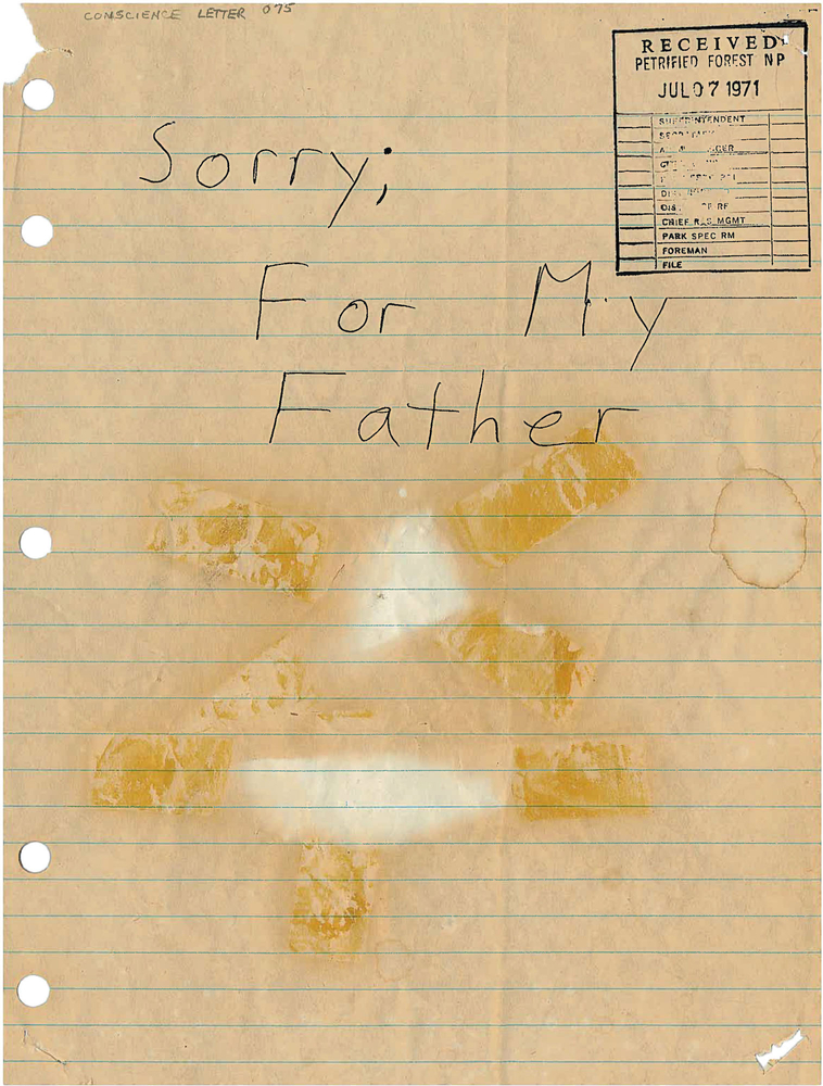Thompson’s favourite letter from the series is one in which the author has simply written, ‘Sorry; For My Father’ in big letters. “I’m especially taken by the letters that reveal deeper truths or can be read in multiple ways,” he says. “This one could be a kid apologizing because his father told him to, or it could be a kid apologizing on behalf of his father. It could also be an adult son. In any case, we can also read it as a generational reckoning. We’re always apologizing for the misdeeds of our forebearers and attempting to make better mistakes.” In other words, it may start small—a single rock—but that impulse to control or own reverberates and grows, right up to the ways industry has depleted our natural resources.