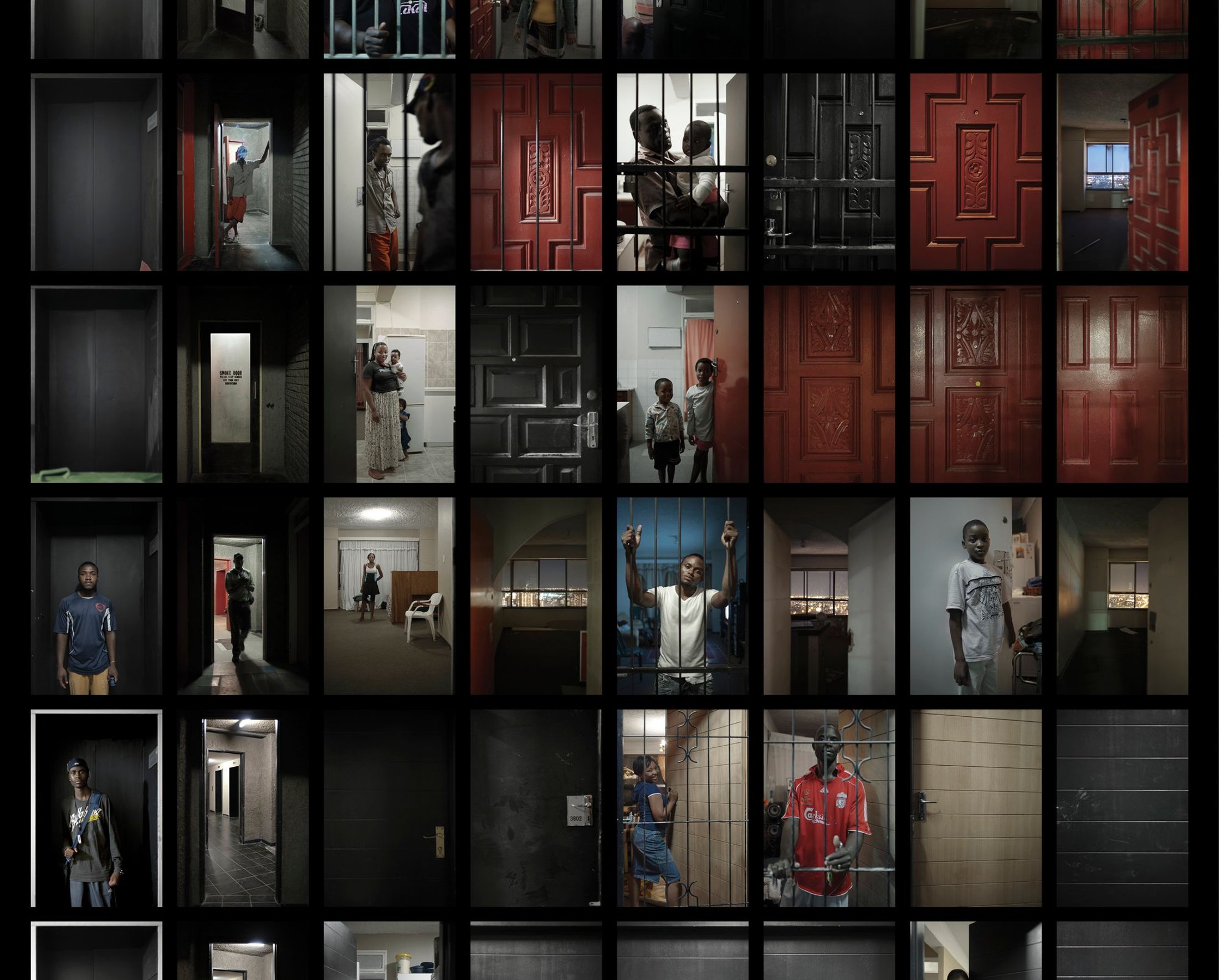 Combining photographs of a derelict Johannesburg skyscraper—one of the city’s icons—with abandoned objects found within, Subotzky and Waterhouse’s work commands attention through its narrative nature. The tower, named Ponte City, was initially intended for Apartheid Johannesburg’s white elite. After a real estate bust, it eventually became a refuge for immigrants, dealers, and criminals—and a lightning rod for controversy. When news of the building’s refurbishment sent squatters scattering, snapshots and personal papers left behind illustrated life inside Ponte City. The layering of snapshots against images of the abandoned apartments creates a keen and thoughtful contrast. Light boxes display photographs of Ponte City’s doors and the scenes from its windows, mimicking the ironically aspirational architecture of the building.