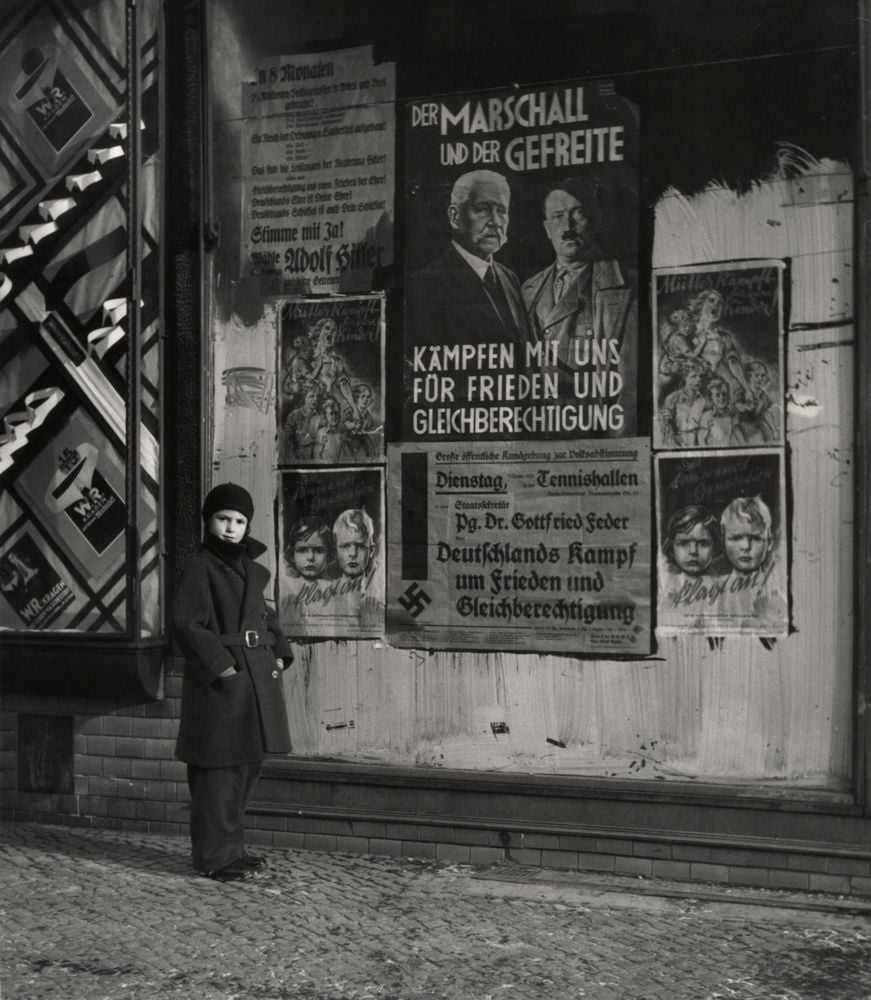But he must have sensed that the Fascists were moving in quickly, and in one photo of street life a swastika flag is seen above a store front. Nazism never marched into the city as it did in Vienna and Paris—it crept in. And Vishniac, alert to its pace, took photos that were more explicit than any he had taken before. He had his daughter, Mara, pose in front of an election poster for Hindenburg and Hitler that reads, “The Marshal and the Corporeal: Fight with Us for Peace and Equal Rights.” Lies were ever such.