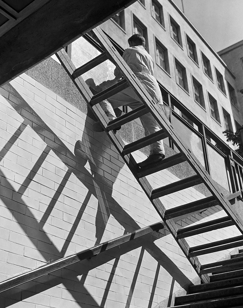 There is another unique aspect to his work from these Berlin years: an aesthetic dimension that lies alongside his awareness of the precarious plight of Jewish citizens in Weimar Germany. His photographs reveal a modernist accent that responds to urbanism’s spatial geometries and the shifting patterns of light and shadow in a built environment. The noir-ish chiaroscuro of his shot inside the Anhalter Bahnhof railway station (which was later almost completely destroyed by Allied bombing), as well as his photo of a window-washer balancing on a ladder, are two examples of the new aesthetic he was in the process of acquiring.