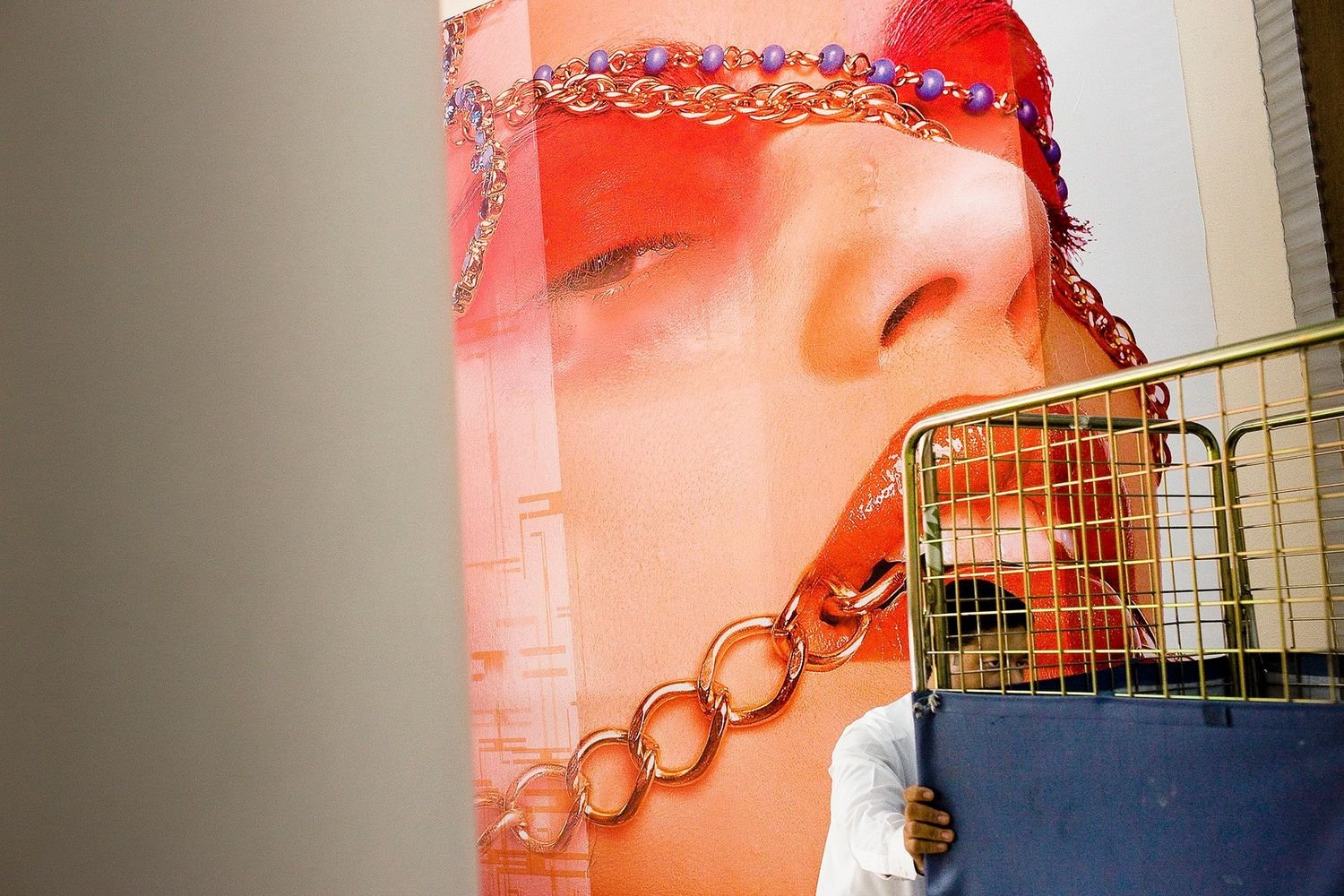 In one of the most charged juxtapositions, taken in Dubai, a worker is enmeshed by the cage trolley he is pushing and dwarfed by the image of a woman’s face behind him. Setting up a fantasy of sexual enslavement, the woman in the huge ad is adorned and eroticized with decorative chains, one of which suggestively runs through her mouth. All this is played out against the implied subservience and entrapment of the worker. The image spectacle is not undone or unmasked here, instead Derksen’s photograph shows how its allure and spell dominates and binds.