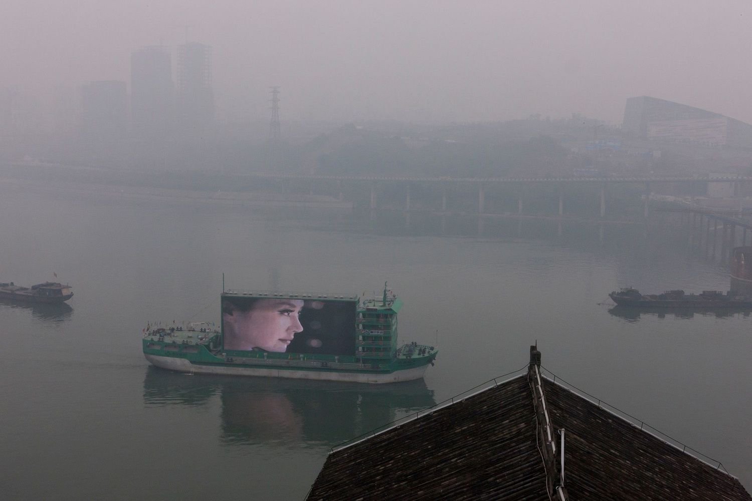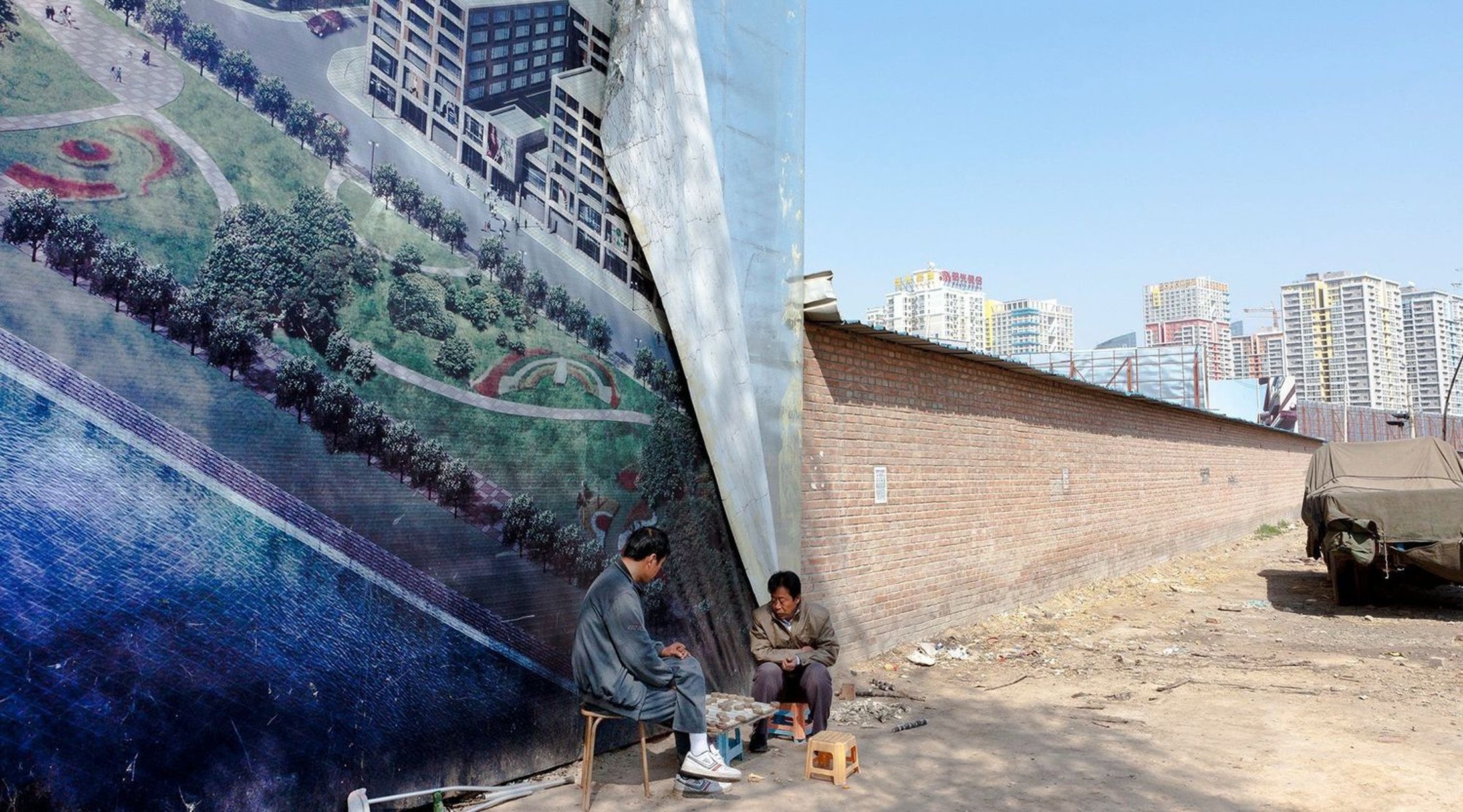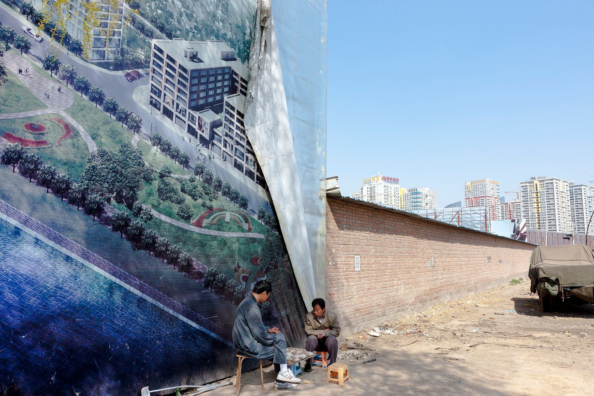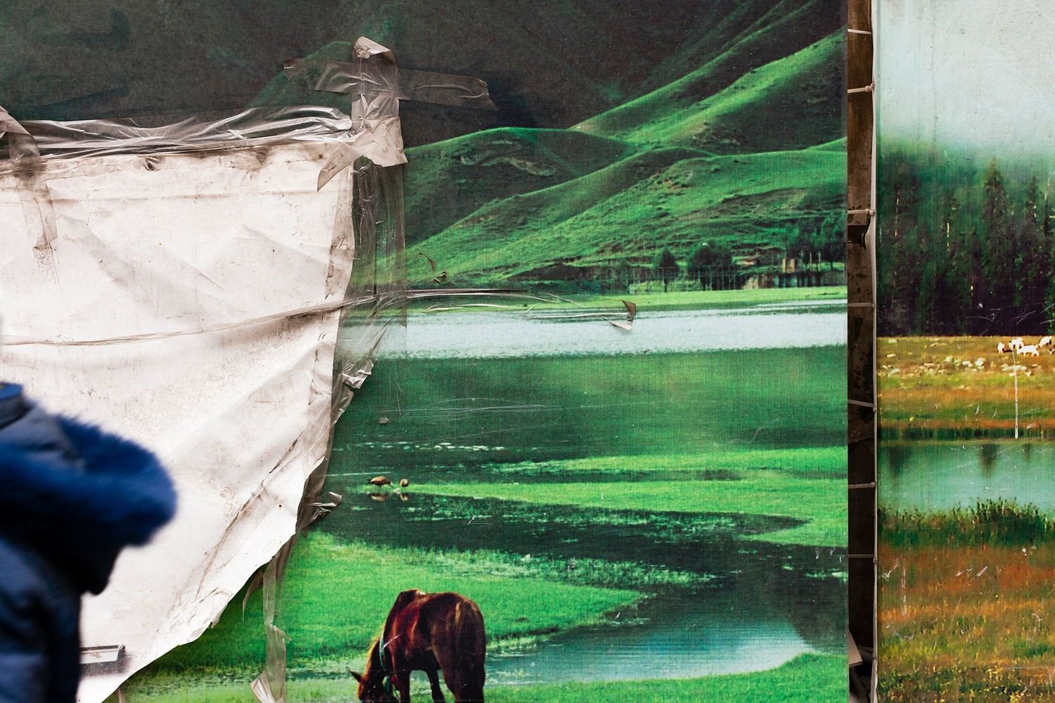 These digital globally-widespread images often have a material presence in Derksen’s photographs. Their surfaces are not untouched or seamless, but are often shown marked, damaged, peeled back, broken up. City dwellers crop up in the photographs, but are more incidental and inactive, often just going about their business, amidst the clamoring signage. In a photograph from Chongqing, among a series of facades bearing images that show architectural visions of city development, a solitary man appears to be caught absorbed in removing something from the metallic surface of the one empty screen.