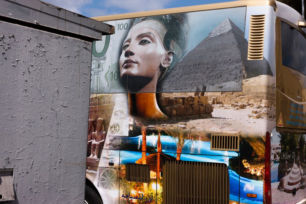 A photograph from Cairo, for example, shows the back-end of a tourist coach, adorned with a flashy montage of pictures advertising the country’s attractions, against the foreground detail of the flaking grey-painted surface of a kiosk structure. It typifies the kind of formal collisions running through these pictures, the way in which hyped-up promotional appeal jars and collides with a situation and context that is dull and grey by comparison. The Cairo picture is however given another dimension and visual complication by the fact the image of one of the Pyramids on the coach is also grey as it is drained of color for contrast against the other colorful tourist images.