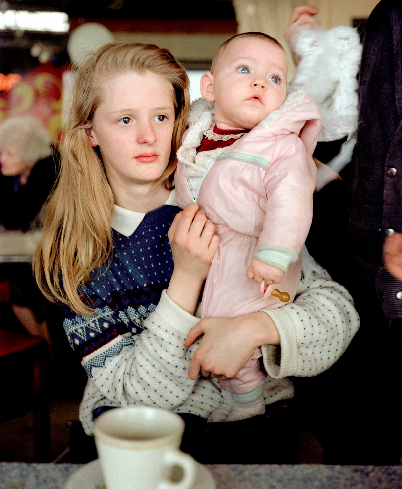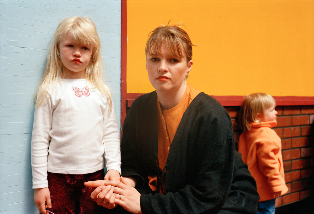 Wood is an artist who is genuinely interested in the people he photographs and many of the pictures testify to the rapport that he has struck up with them, and not just fleetingly. Two early pictures in the book, made fourteen years apart, set its tone—a portrait of a girl in her teens in a red dress and top against a pale blue wall is paired with a picture taken when she is a mum in her early thirties, together with her young daughter. The little girl also stands against a pale blue wall but it shifts to a band of orange above the brick behind her mum who has crouched down beside her.