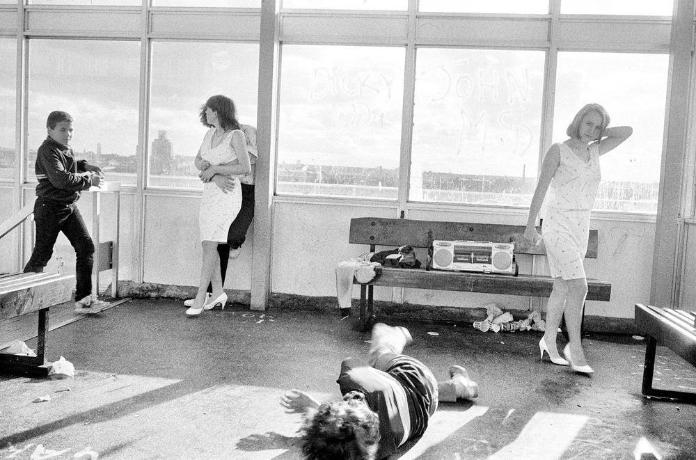 In the book this picture is preceded by a spread showing teenagers larking around at Liverpool’s ferry terminal. Space is integral to both pictures, broad interior views with a lot going on in them. The juxtaposition is powerful. In a striking formal correspondence with the old man curled up on the carpet, one of the kids is also on the floor. But he is rolling about, breakdancing, which explains the double cassette deck on the bench behind him.