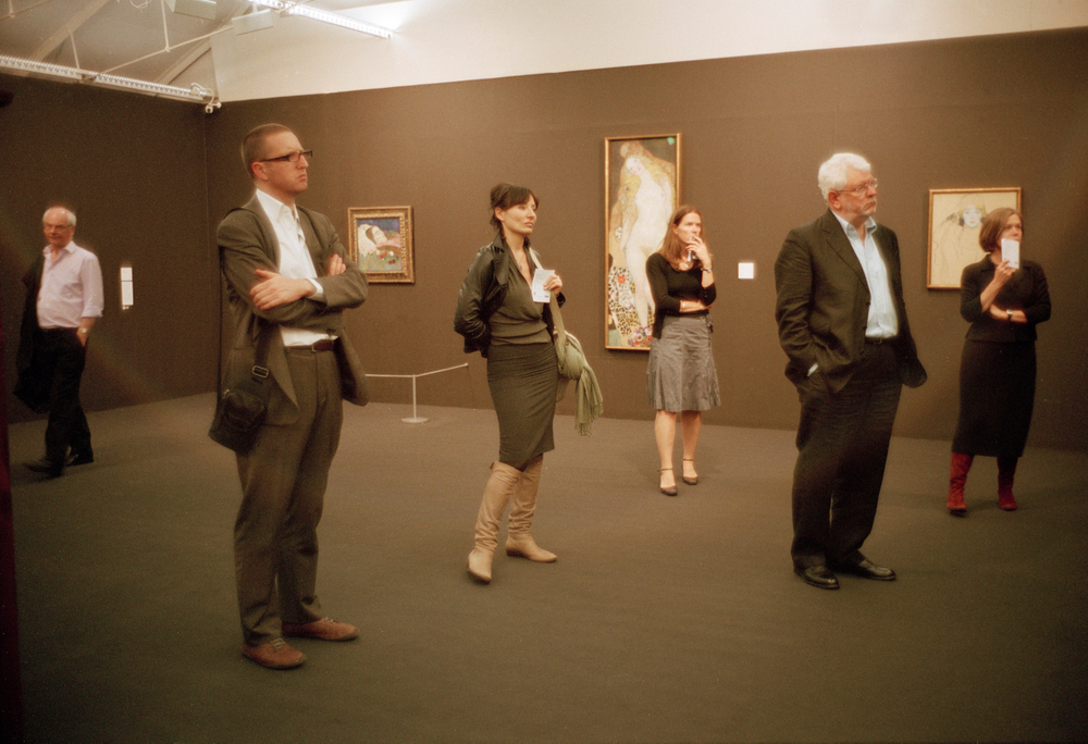 In the Tate picture, people are totally wrapped up in their thoughts. It is very much a picture of absorption and detachment, each person evenly spaced out within the interior, their sobriety of behaviour matched by their dress, which is echoed in the browns of the gallery space. Even the three Klimts displayed on the wall behind them seem to suit the colour and mood of the scene. But this is not all. A sixth figure to the left of the photograph breaks the stasis and appears to have clocked the photographer, or is certainly looking his way as he moves away from the static viewers. It is a small but vital disruption, a little moment of release from this more rarefied cultural realm and a small sign of the animation and sociality that is otherwise central to Wood’s pictures of people.
