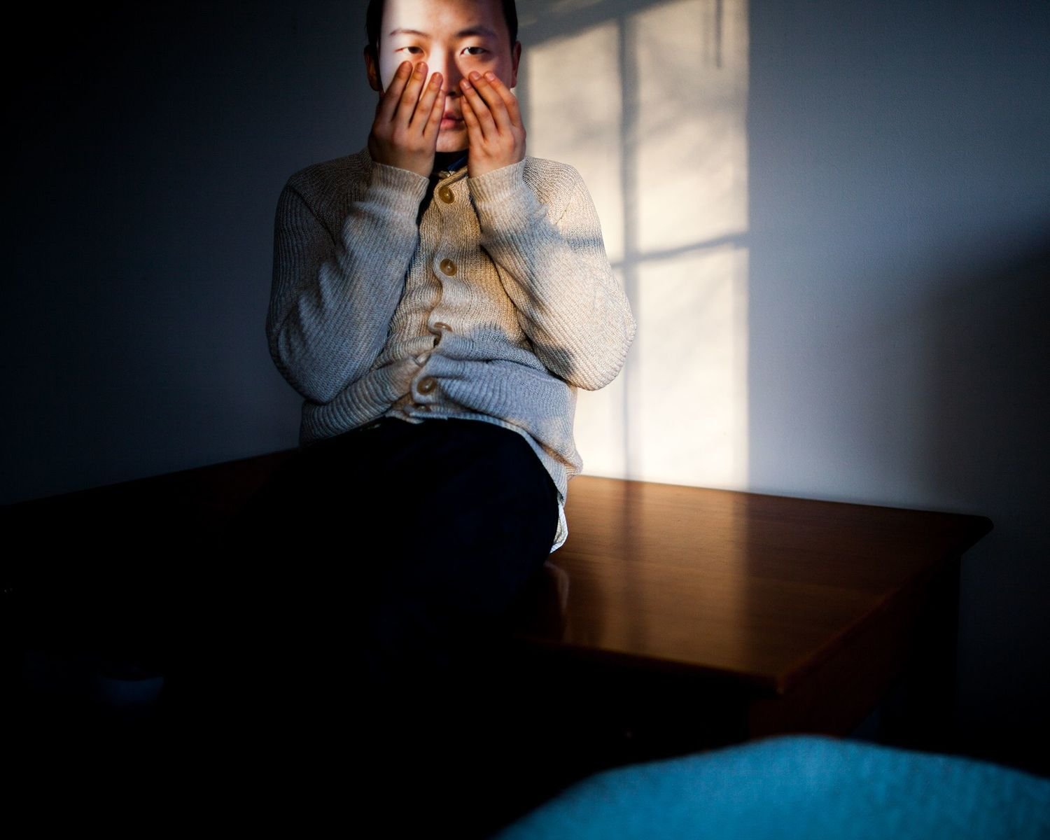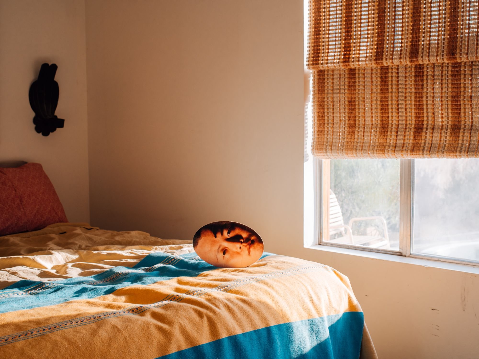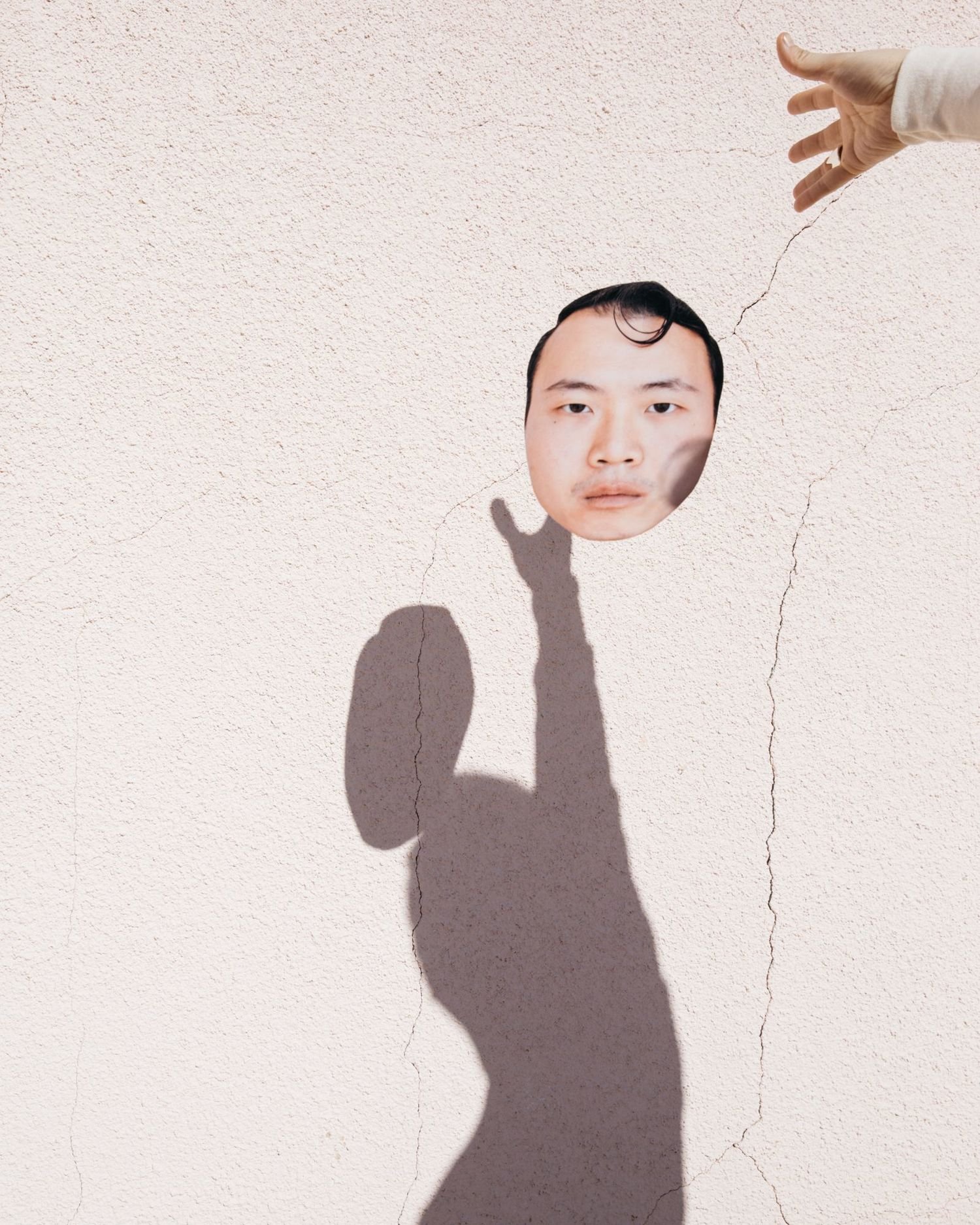 Kha started working on I’m Only Here To Leave in 2015, during a residency at LightWork. The earliest photographs in this body of work include cardboard cutouts of the artist’s face from his existing private archive of self-portraits. For other pictures, he created white cardboard stencils of these cutouts, making it appear as if he had literally cut himself out of his own work. More recently, he has worked with a fabricator to create hyper-realistic masks of his face and used temporary tattoos to give himself the appearance of having four eyes.