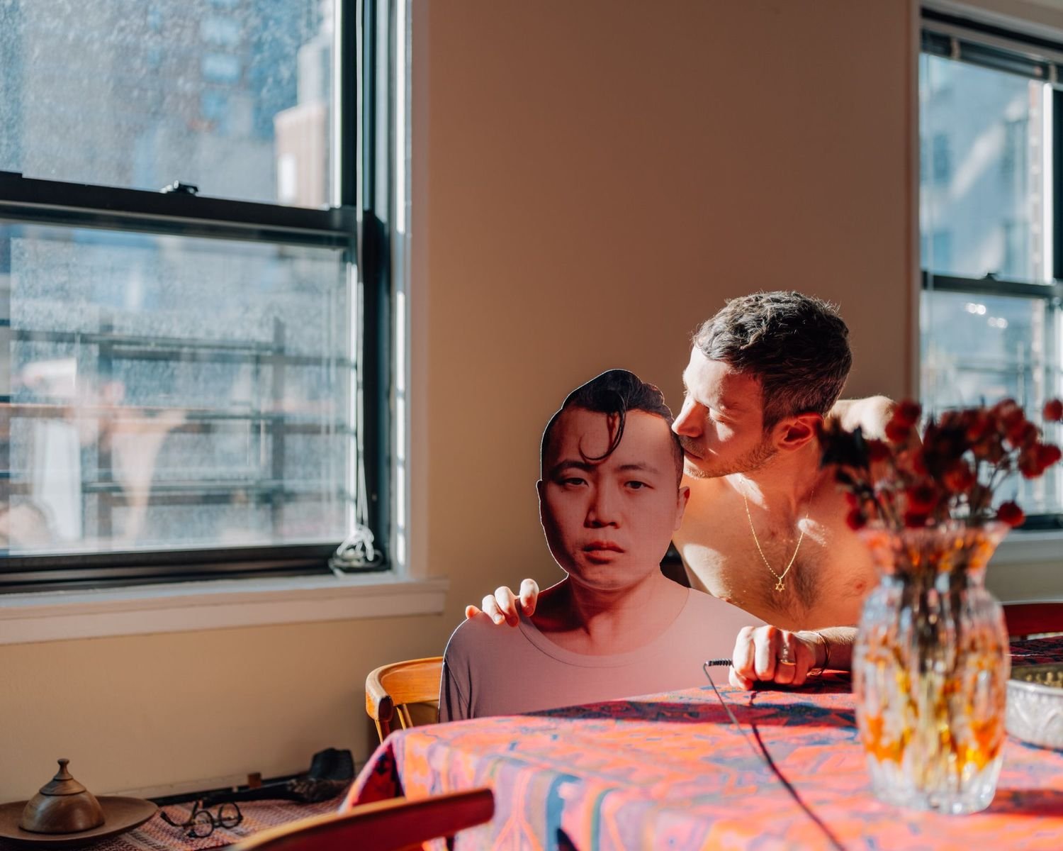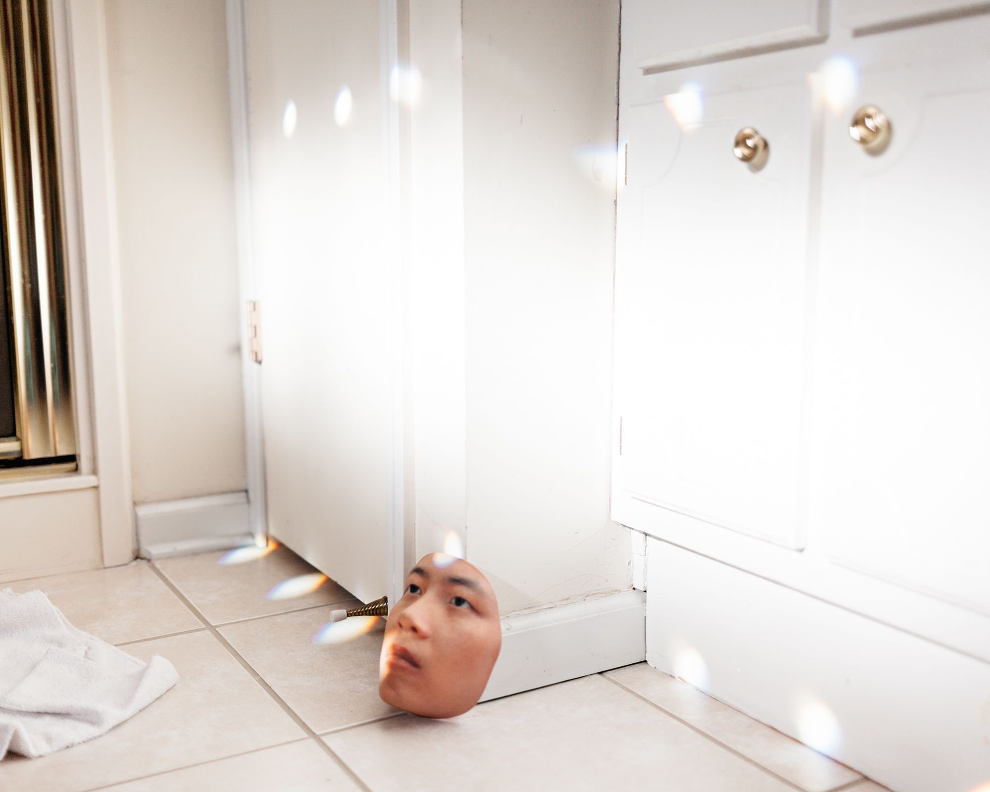 Tommy Kha’s self-portraits require a double-take. His on-going project, I’m Only Here To Leave, includes images of non-traditionally printed self-portrait objects staged within real-world settings. The photo-based artist—from Memphis, Tennessee, who now lives in Brooklyn, New York—explains, “I wanted to find a way of representing myself without literally photographing myself. So instead, I have been making photographs of photographs of my face and body as a way to control my representation.” In these images, the artist and others—family, friends, and strangers—can often be found wearing masks of Kha’s face or engaging with other props that blur the lines between the body and the photographed body.