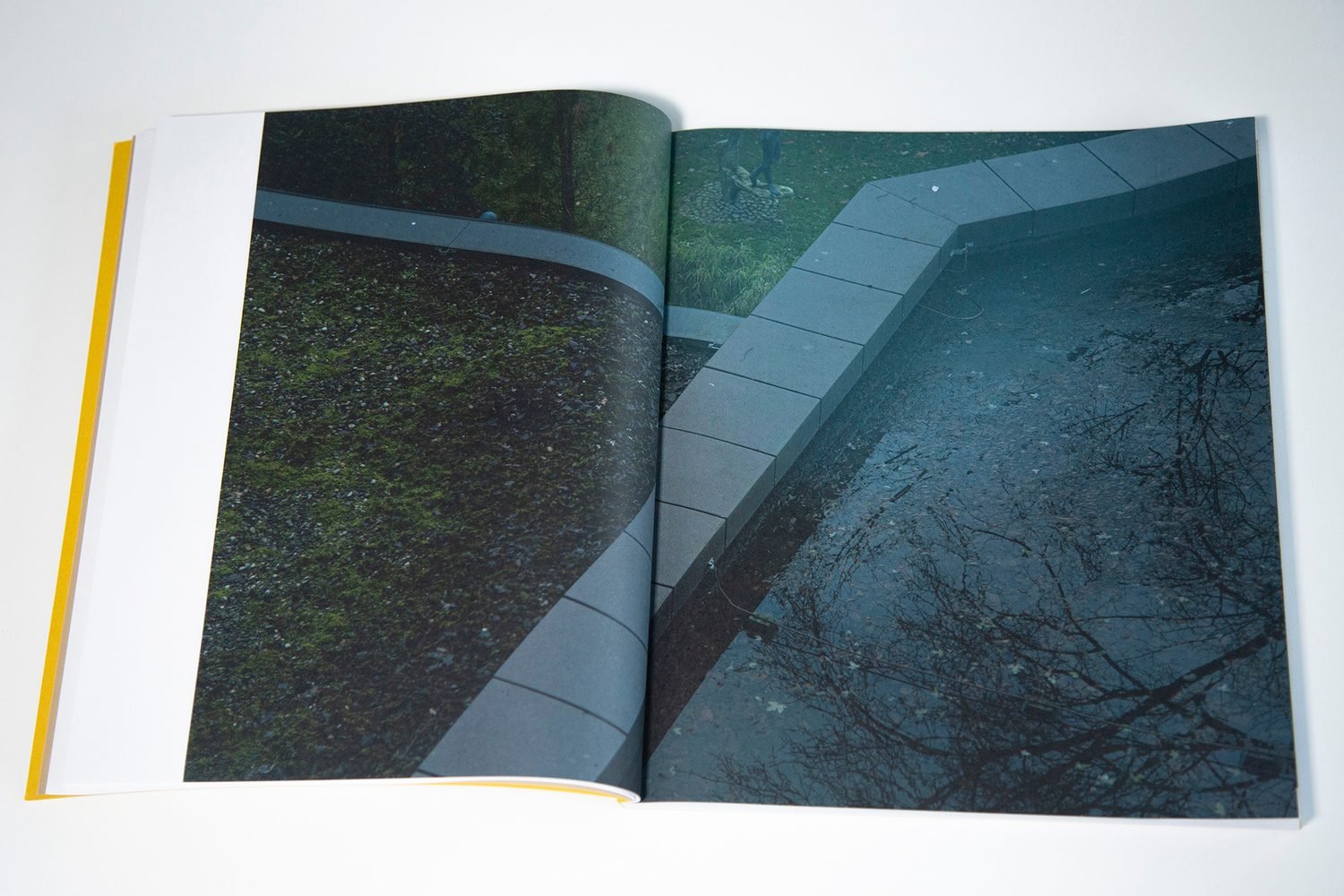 The first image in Dutch photographer Vivian Keulards’ book to Hans is an old archival one from her family album, depicting her and her older brother as small children in 1974. Standing in front of their house in the late-afternoon light they wear helmets and grin up into the camera, his arm around her, their small frames throwing long shadows across the lawn. The image is all washed out orange and warm tones, taken on Kodachrome or Polaroid SX-70, perhaps. Several blank pages later, the next photograph is markedly cooler and starker; part of a concrete-lined pond seen from above on a dark, grey day. Most of the images from here retain this palette. What follows are rainy reflections, shadowy doorways and beds unslept in at the first light of morning. Occasionally, there is a portrait with the face blanked out, or a still life staged for the camera.