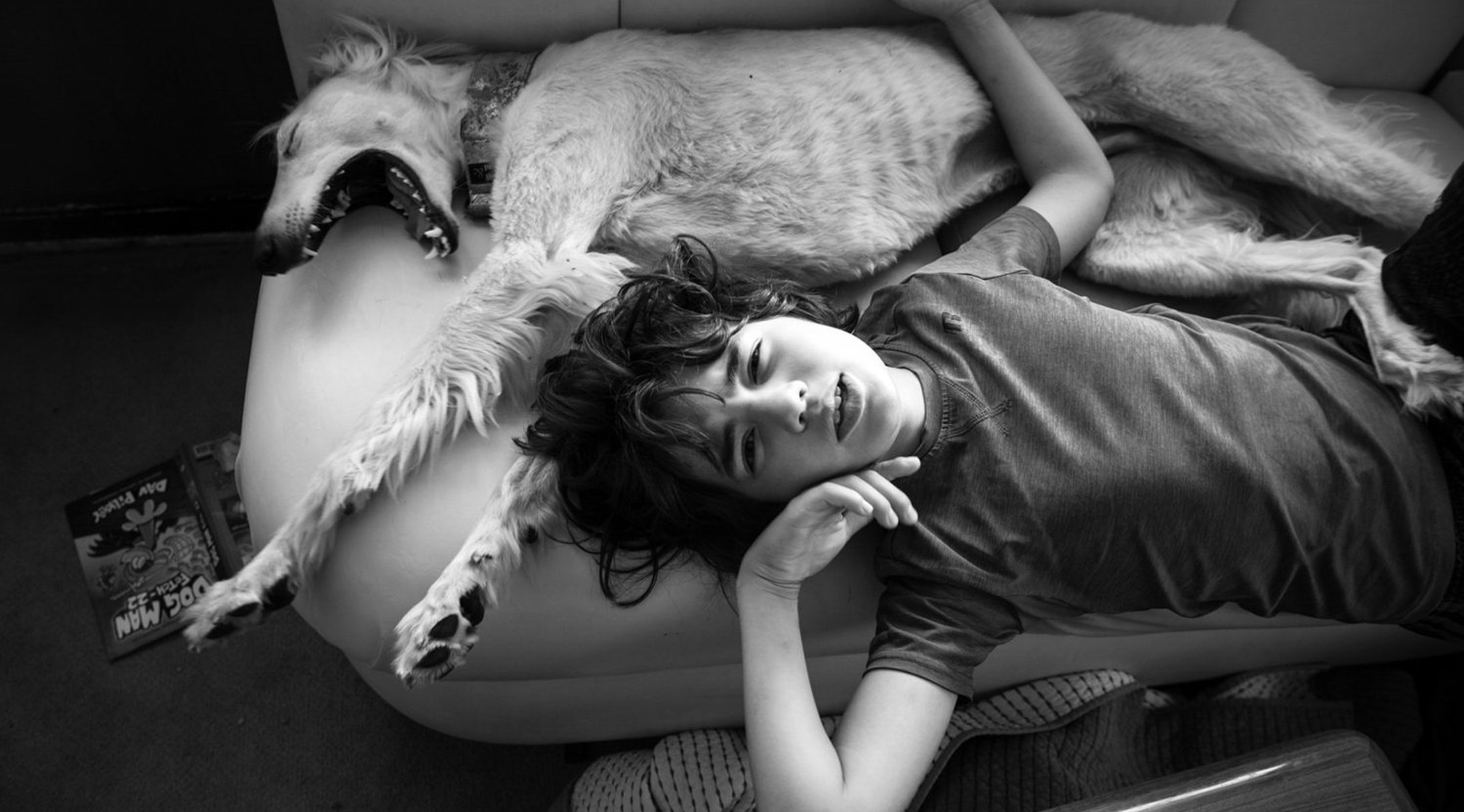Rare is the photograph one can first describe with sounds. And yet, in Wendy Stone’s playful series Siblings, sound is the first of the senses awakened. A child stretched out, limbs akimbo, lies against a dog whose jaw is opened in a yawn so wide you would swear you could hear it. In striking black and white, the photographs shift between moments of chaos and calm as they follow the exploits of this ragtag crew of siblings.