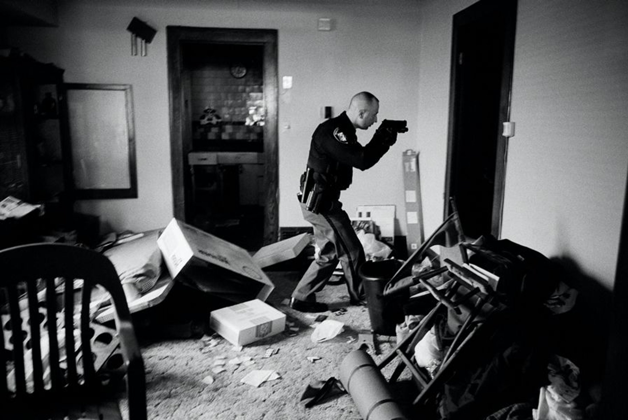 black-and-white picture shows an armed officer of the Cuyahoga County