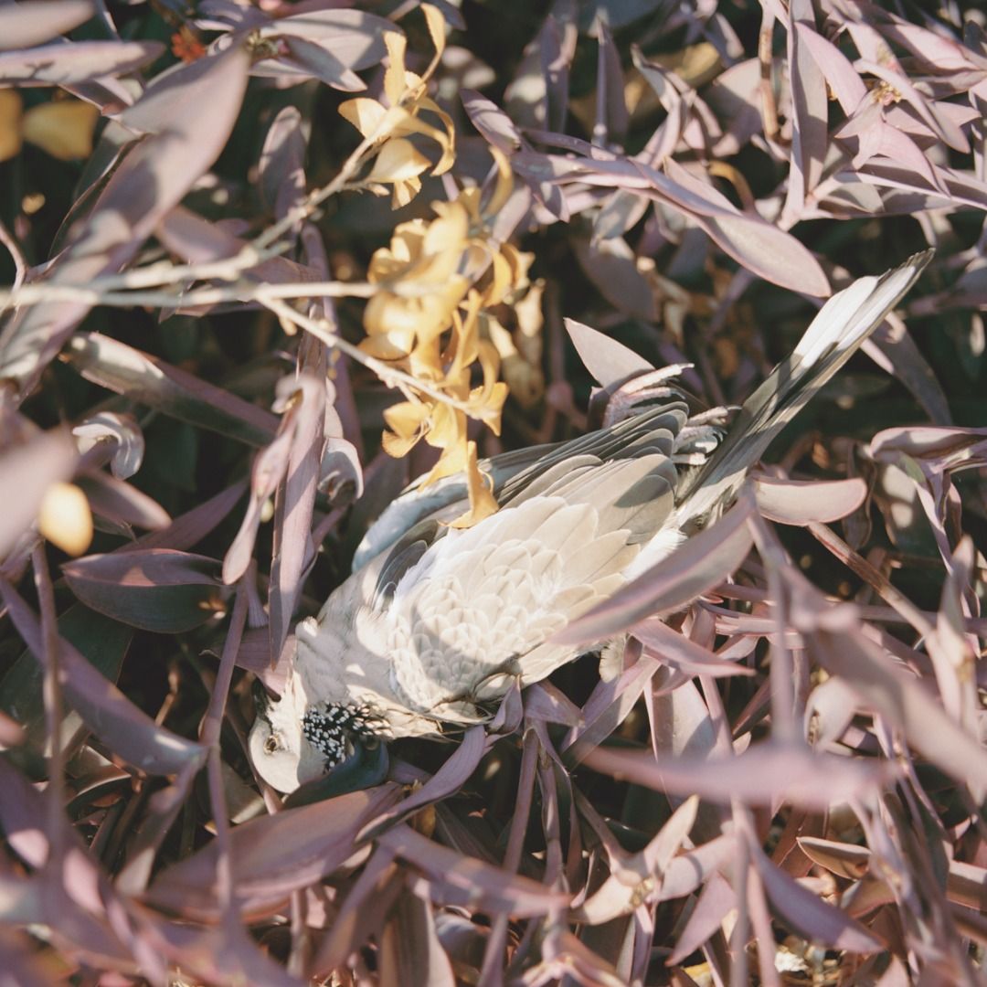 Close up of purple leaves cradling a dead, pale grey DOVE. Sound of CROWS and buzzing FLY persist.