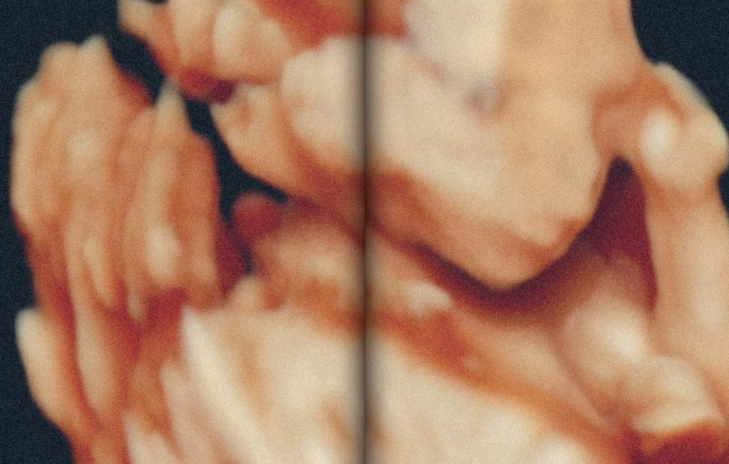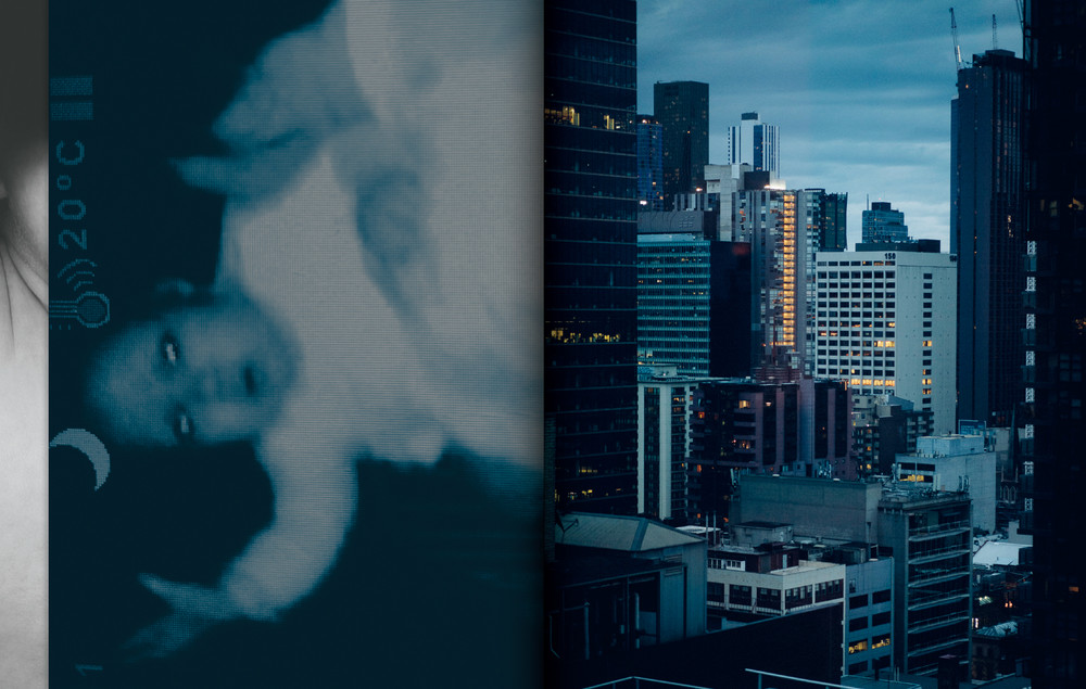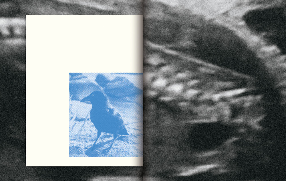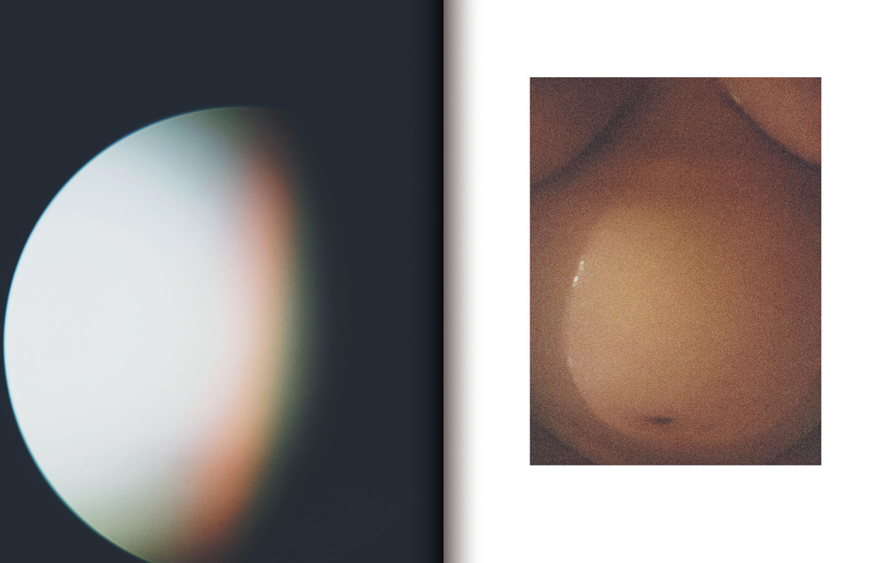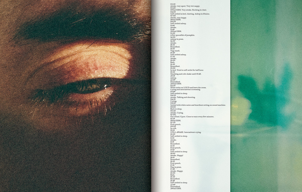This opening structure is important to note as what follows in the cacophony of imagery we are presented with oscillates between the manic, the incredibly dark, the gentle, the dreamlike and the intimate. Ang uses a range of visual methods and approaches to invoke an inability to settle or to gauge what we are seeing. We get night vision imagery from a baby monitor-camera, we get 3D renderings of a foetus, we get melancholic traces of everyday experiences—exhaustion, birthday cakes, baby swaddled, sunsets out of a window, bath time. Interspersed are black and white self portraits, risograph printed pages of escapism (or imagined escape), nature, bodies and text.