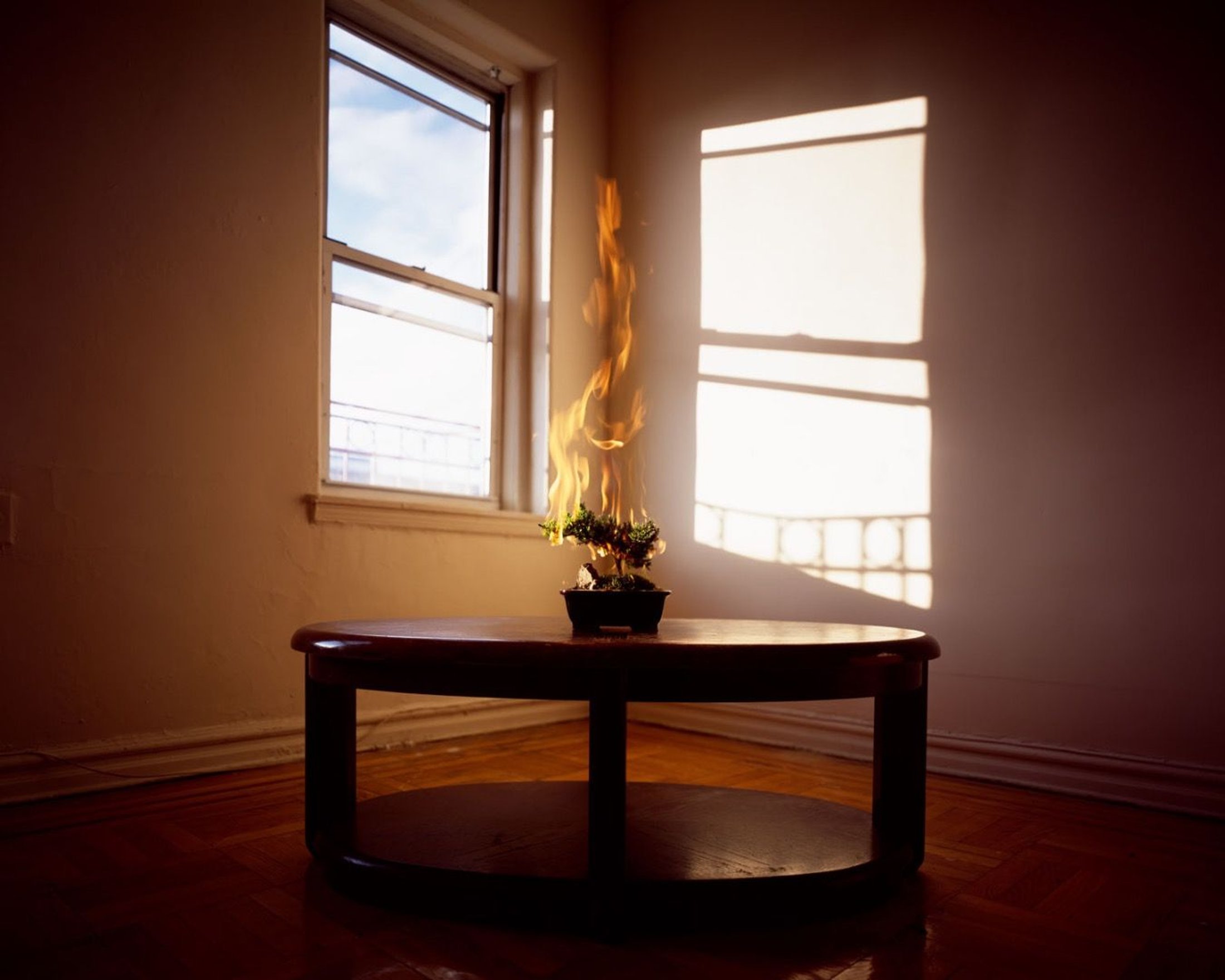 Of course, he couldn’t have known what was going to happen next. He set up his camera, plate and a green bonsai tree that he doused in fuel and lit on fire. Friedlander captured his image of a burning bush but when he extinguished the fire, the tree still remained green. He says it was one of the most profound spiritual experiences of his life—leaving him conflicted yet also “open-minded about the contradictions we find in everyday life.”