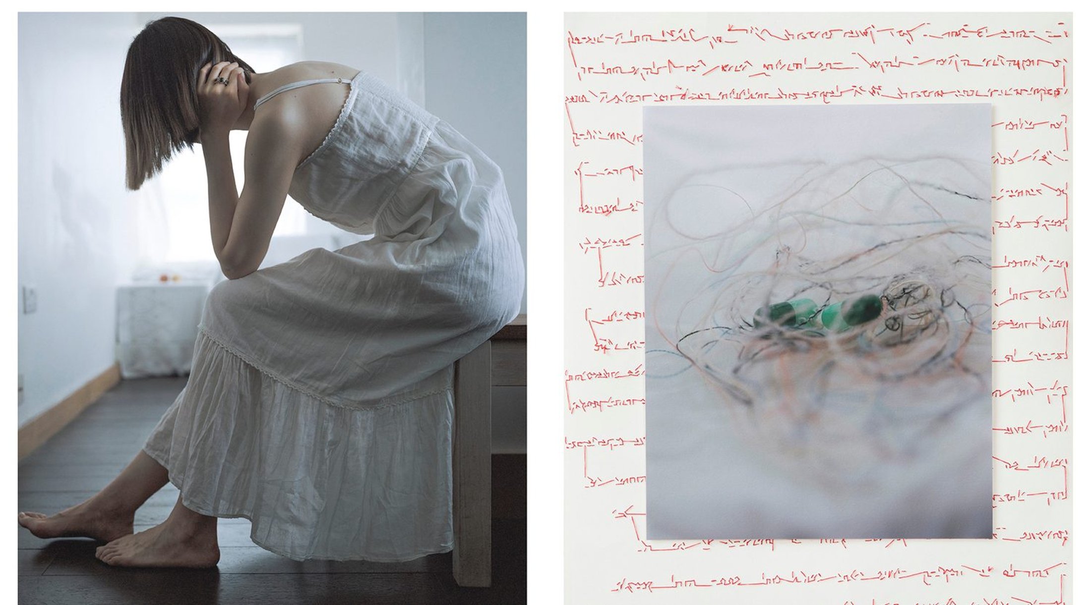 Chen’s subjects and their corresponding objects range from the practical to the emotional. Lu gazes into the distance while her ashtray reveals a smiley face in the soot. Xiao, seated at a table and shot from a distance, is paired with her empty dishes resting on a windowsill. In the portrait of a couple, Lan and Chi, hands repeat—gracefully caressing a cheek here, outstretched in another to show a wedding ring. In an enigmatic pairing, a young woman named Leng, dressed in green and blue, hugs herself, her eyes peering over her crossed arms and out of the image. On the other side is a small, seemingly knitted sculpture, similar in color to the clothes she wears. Its form is vague, noted as ‘handmade stuff’; it feels mysterious and personal.