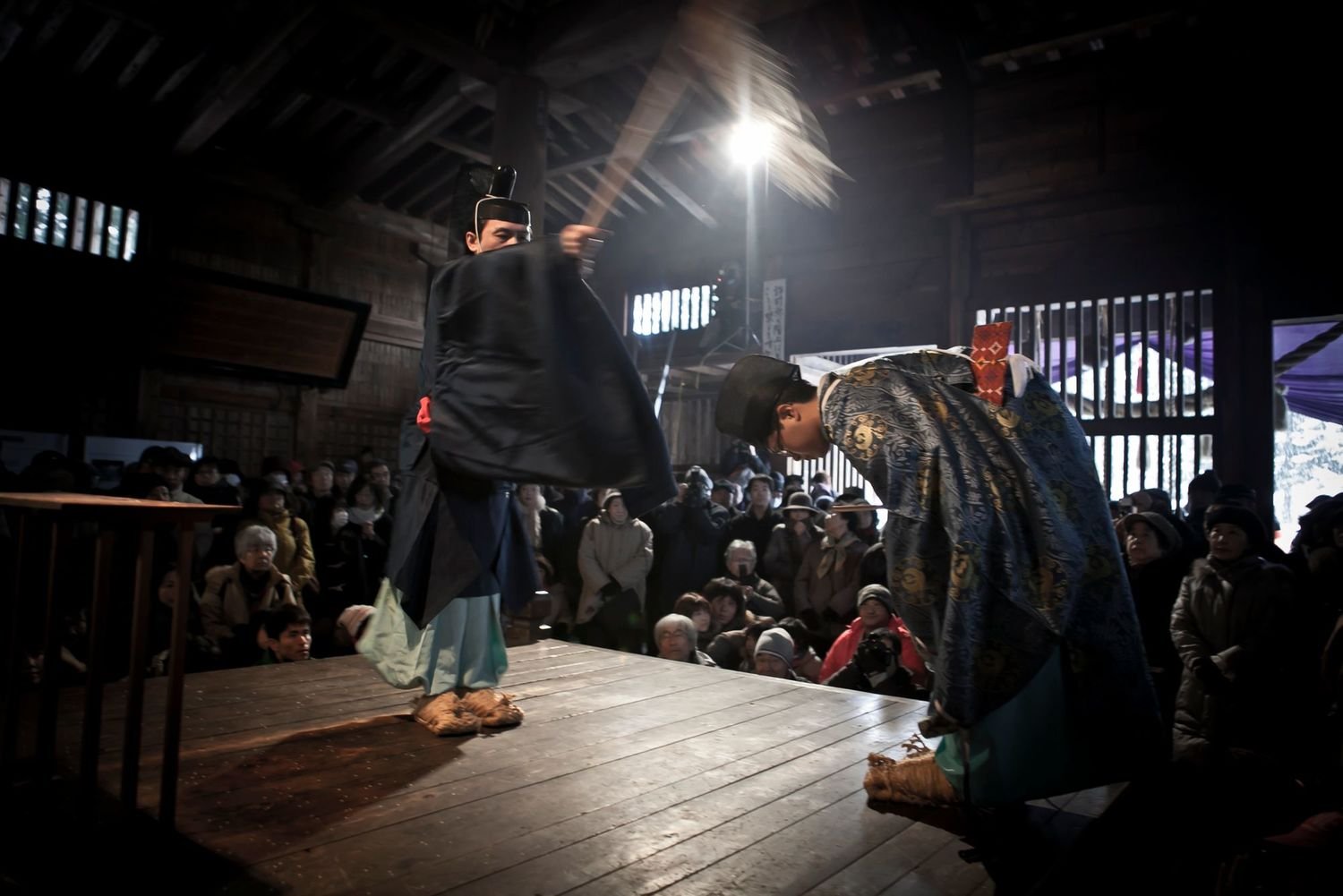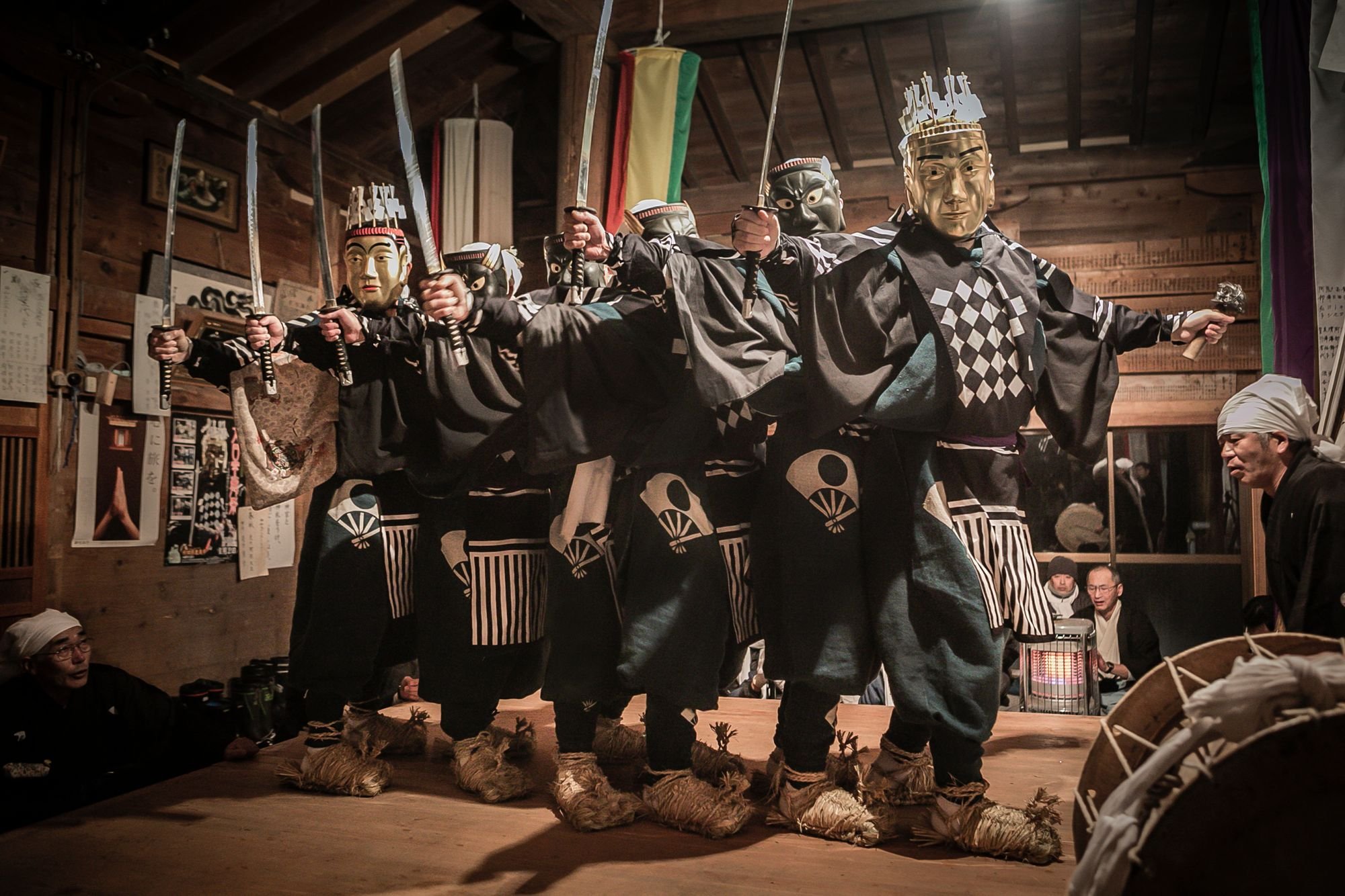 Before the ritual, the noshu—the people performing the sacred dance—are required to undertake a very strict purification. In the longest documented cases, some of these noshu are known to have gone through 48-day long periods of complete abstinence. During these periods of religious asceticism, the participants are prohibited from sleeping in the same room as their spouses and must avoid childbirth and death. They must also not eat the meat of any animal that walks on four legs. Though currently preserved as a part of the purification ritual in only a few of the localities, a ritual involving the performance of mizugori (cold water ablutions) also exists. This ceremony is performed regardless of the fact that the place can reach temperatures of -20°C [-4°F] in winter. From the outside, this seems like a difficult task to endure. But for them, it is all part of their life and the rituals that surround it.
