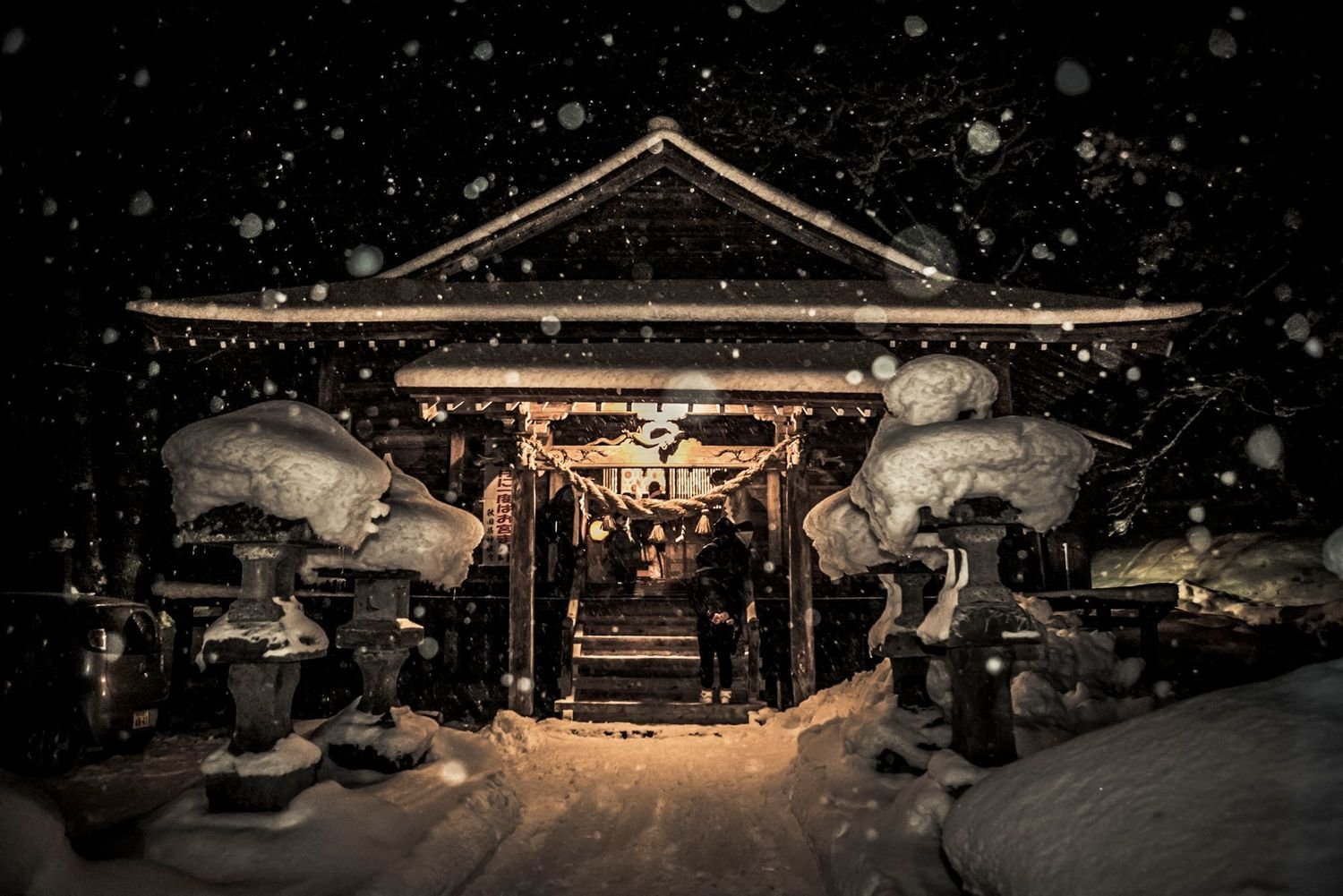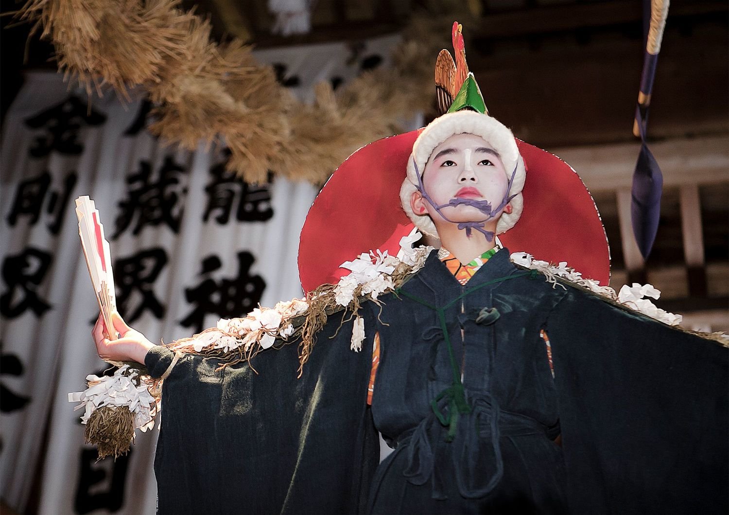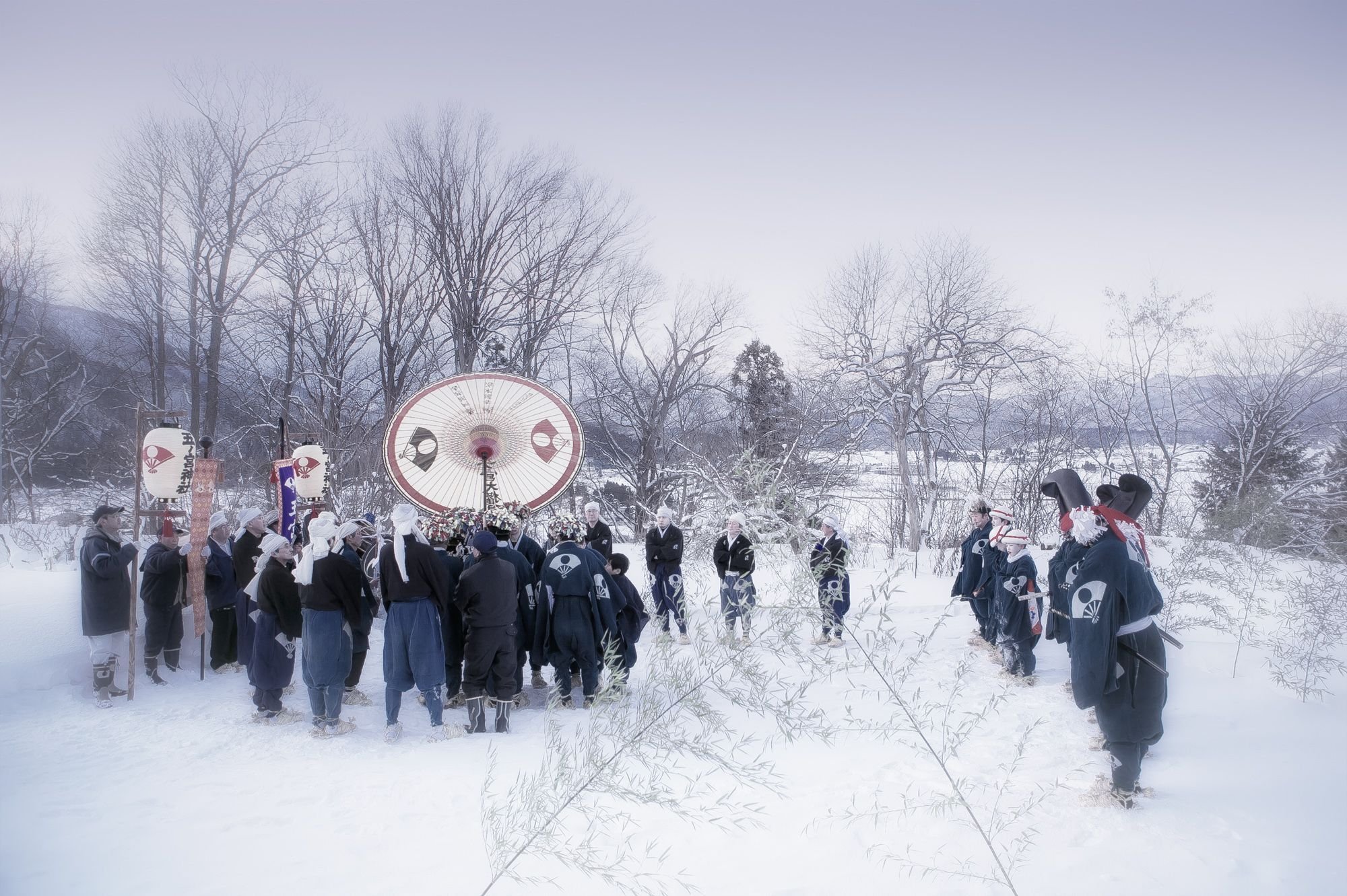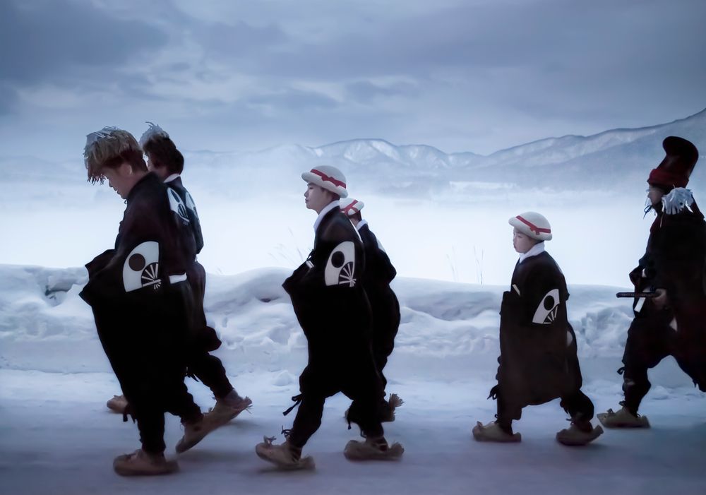 In this village, the inhabitants were performing a shrine ritual that had been practiced for over 1300 years. One after another, the people from four local communities—Ohsato, Azukizawa, Nagamine, and Taninai—carried out an elegant dance dedicated to the patron god of the shrine. This festival, called Zaido, is said to be based on an old legend. The rituals take place on the second day of every new year, well before the break of dawn, for the dances themselves start with the first rays of the sun. At that time, the people of these communities make their pilgrimage to the sacred sites where the seven ritual dances—Gongen-mai, Koma-mai, Uhen-mai, Tori-mai, Godaison-mai, Kōshō-mai, and Dengaku-mai—are performed with the hopes of good fortune in the New Year. Young and old alike take part in the festivities wearing different costumes and masks. The ritual ceremonies demonstrate a dual set of values: they highlight the cultural variety of the communities as well as the unbreakable bond between the generations. Therein lies the key to the ritual’s longevity.