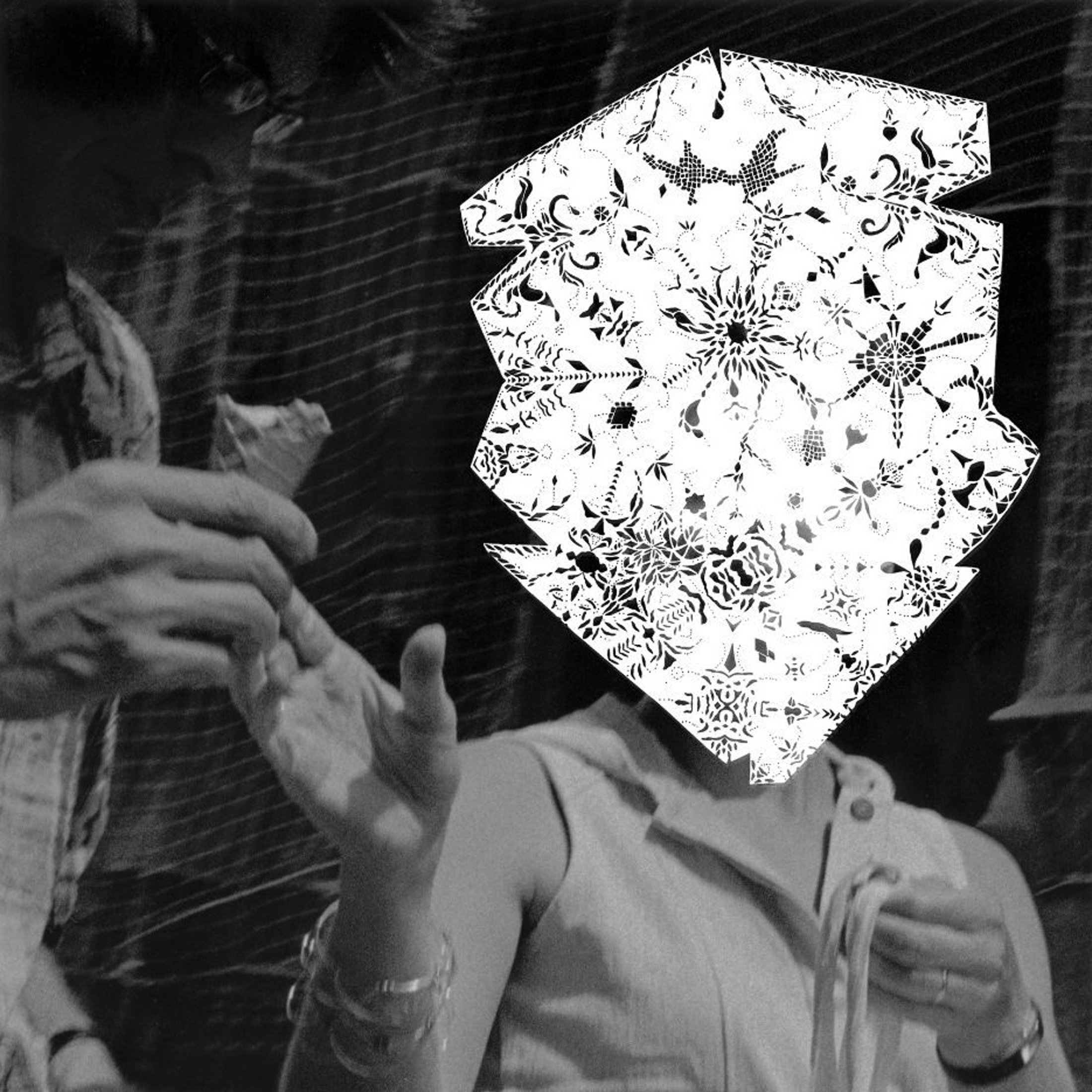 These flat photograms both shield and reveal the faces of the anonymous subjects, much like a mask, or a fan, or a lampshade. The quirky results could also be interpreted as cartoon-like thought bubbles that represent the visual thought patterns of the strangers in the photographs.