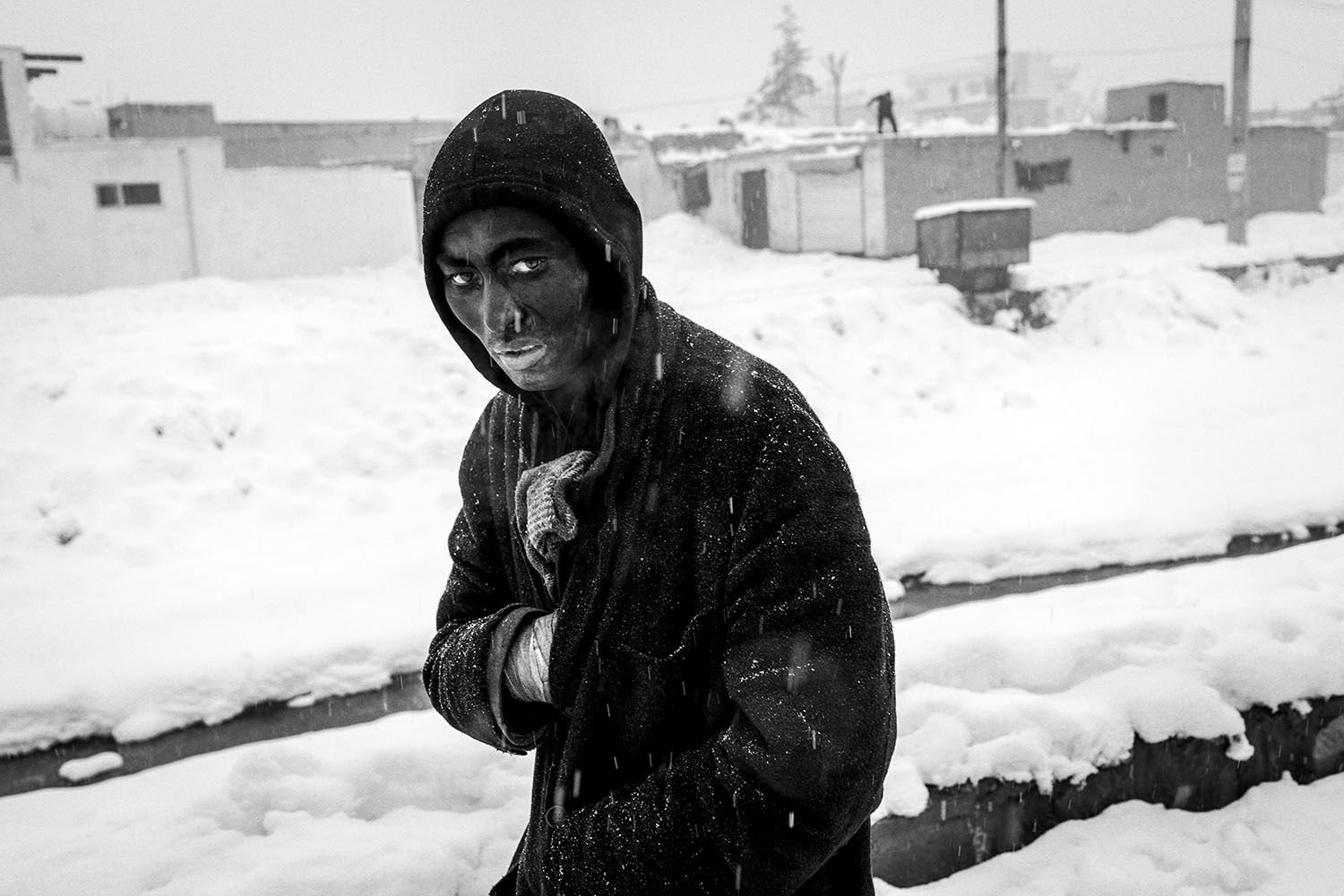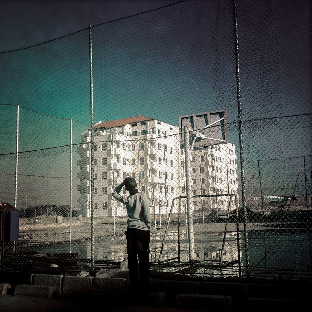 And yet, even in this “Dreams” section there is evidence of the country’s ongoing strife. In one striking quadriptych, the faces on posters have been violently scratched out, leaving them unidentifiable. “Dreams” ends suddenly, without warning (how’s that for symbolism?), a pitch-black spread overwhelming the viewer’s vision. All of the color that flooded the previous pages is smothered and overcome. We’re back in the country. Endless rows of sagging tents and crumbling houses fill the pages—confronted anew by death and refuse as well as a hovering, ominous feeling of unease and danger. In one particularly striking image, a sprawling pattern of gravestones blends seamlessly into a hillside covered with run-down houses. There’s a clear narrative here, a sense of imminence as well as inevitability. The life captured in “Dreams” is encouraging, but what about those who are still suffering?