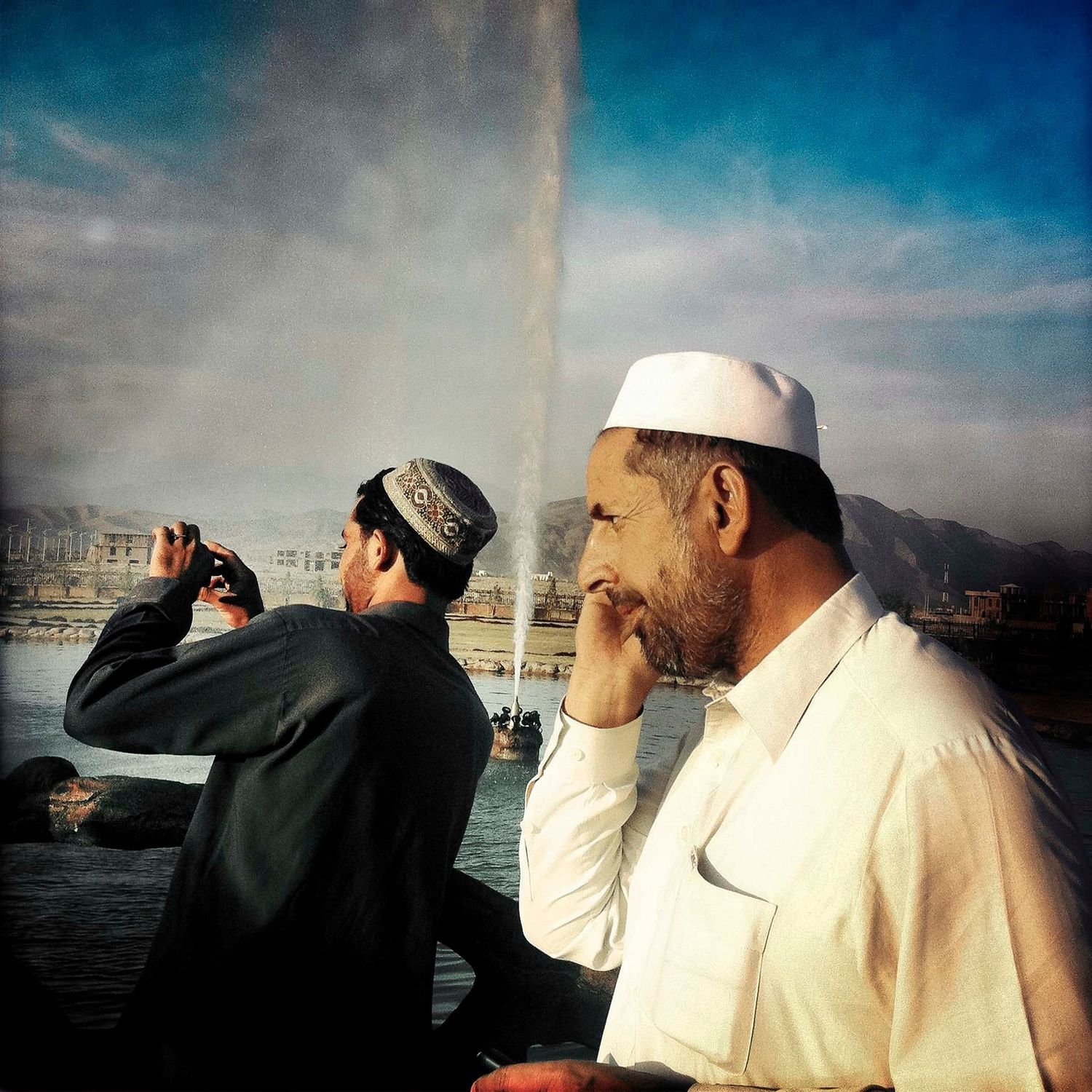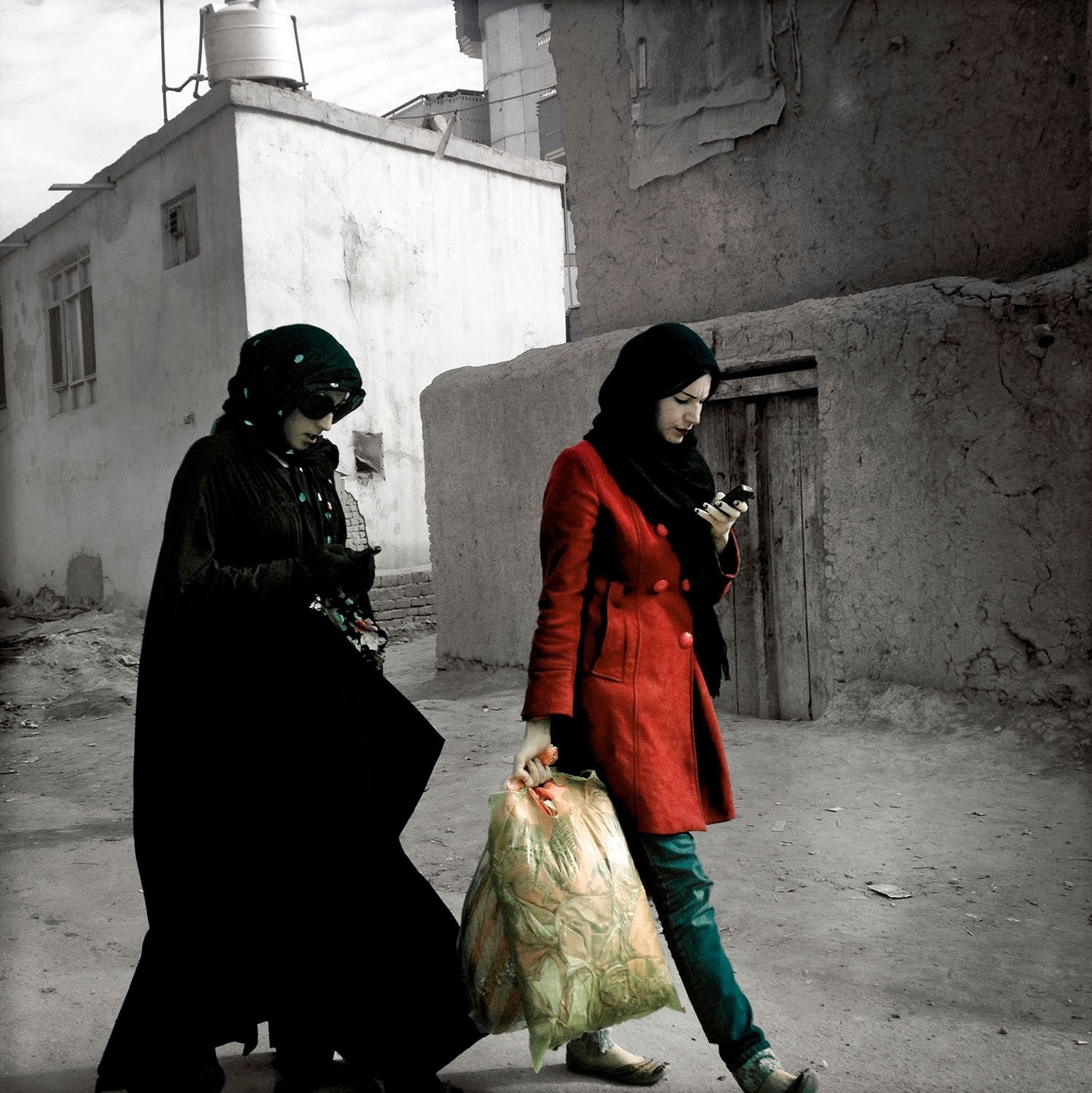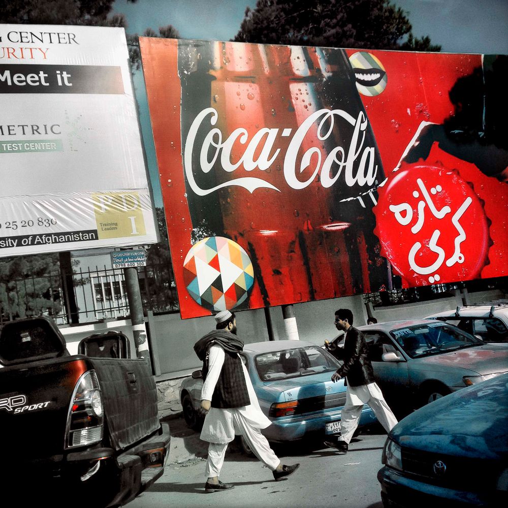 Zalmaï’s color images start about a third of the way through the book. They are prefaced by a frontispiece reading “Dream: to contemplate the possibility of doing something or that something might be the case,” and indeed, the images seem like apparitions after the bleak, colorless images in the first section of the book. Here, the photographer presents his vision of modern Afghanistan. The setting is new: instead of dust and expansive landscapes, we find ourselves in a city, replete with convenience stores, developments, and businessmen strolling the streets. Everyday life—indicated through color—begins to permeate Zalmaï’s world.