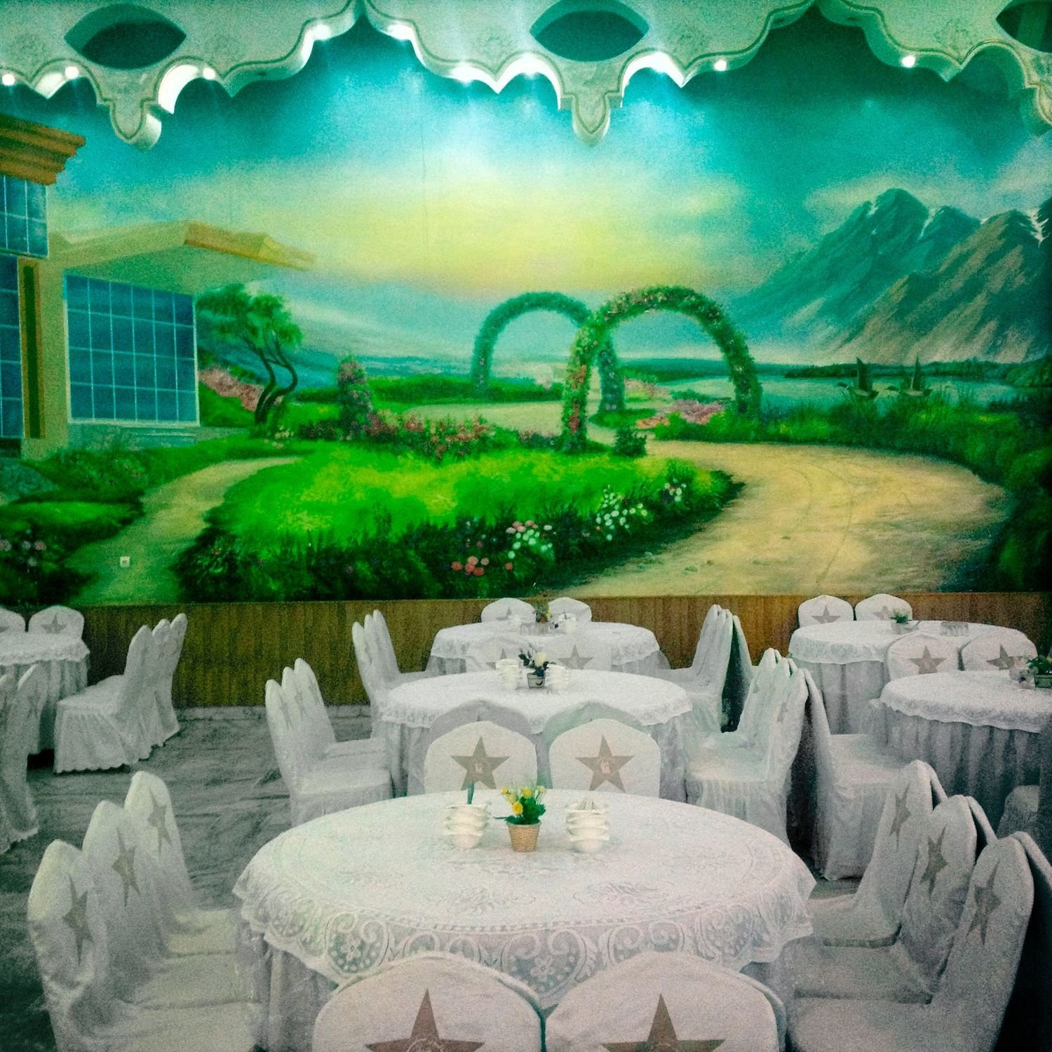 Small details surprise and enthrall: a dining room with perfect white lace tablecloths and a utopian, pastoral wall decoration is like a vision from a dream; modern clothing jumps to the fore in pops of bright color. There are signs for Coca-Cola and other consumer products. In one image, a two men speak on a rooftop. One is dressed in clothing similar to the garb that swathed the first section of Dread and Dreams, his colors muted; the the second man sports a graphic t-shirt and contemporary belt in a deep, bright red.