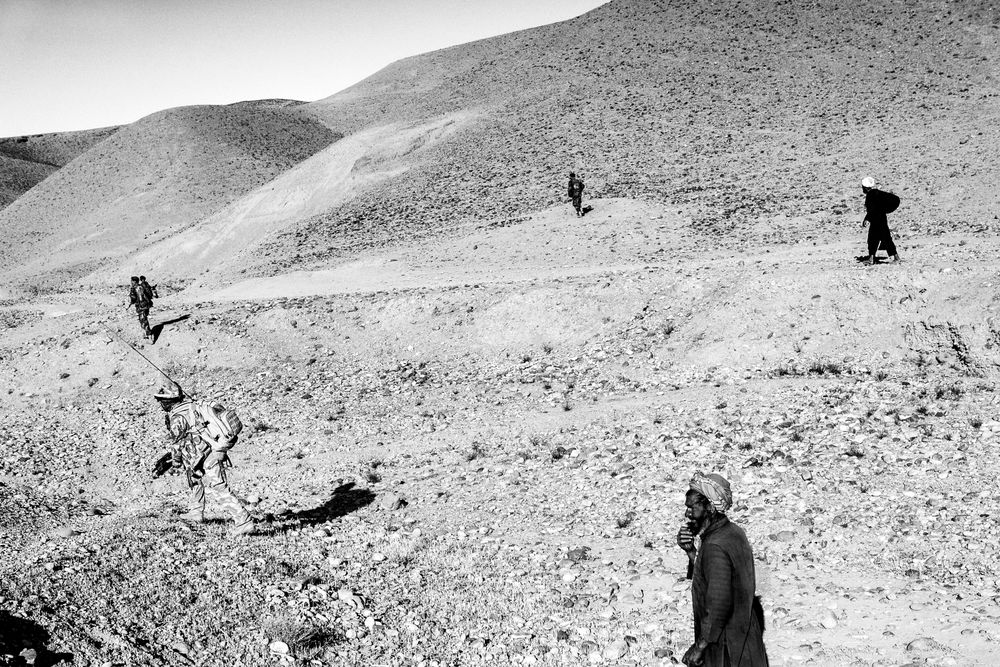 The first black-and-white section presents life outside Afghanistan’s cities. Men wander vast, limitless landscapes dotted with stubby scrub brushes; a woman leans dramatically forward as if struggling to make headway, her black robes flowing around her body, the home around her reduced to rubble. Immediately apparent in this first section is the military presence in the land: in the book’s very first image, six figures traverse a small valley. Three are Afghan men in robes; the remaining three are soldiers. At first glance, only one soldier in the front of the frame jumps out at the viewer: his attire and posture make him conspicuous. On closer inspection, however, two faint figures in the background swim into view: they, too, are soldiers, but they’ve permeated deeper into the landscape.