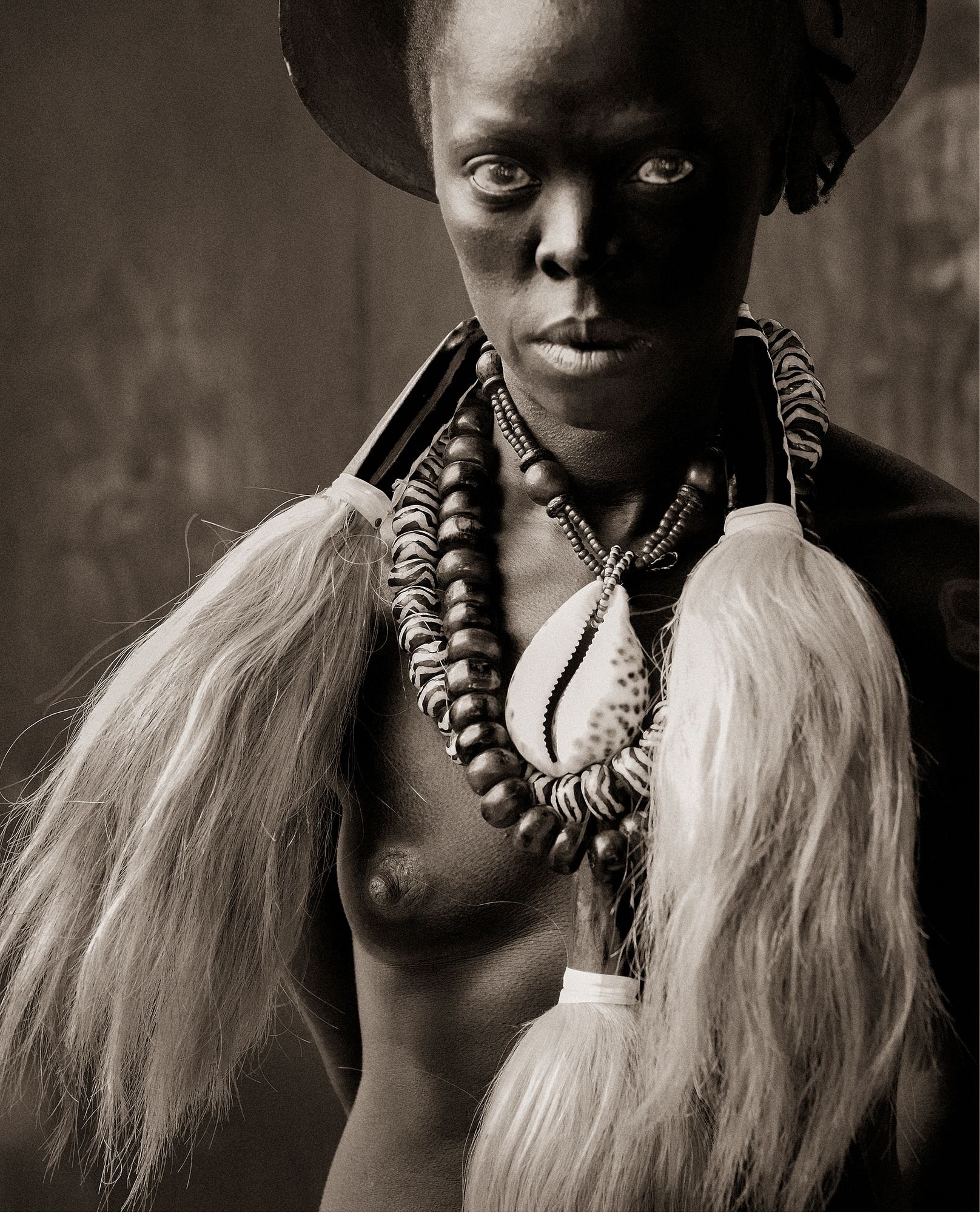 With her newest set of self-portraits, Muholi meddles with the viewer’s expectations and assumptions. Self-aware and interrogative, the portraits are serious reflections on the genre and her place in it. As Muholi dons different clothing and accessories, she slips into different facets of the characters she creates. Witnessing this kind of self-portraiture is uncomfortable in its intimacy. Muholi is probing the depths within, an intense process that elicits a range of raw emotions both for herself and the viewer.