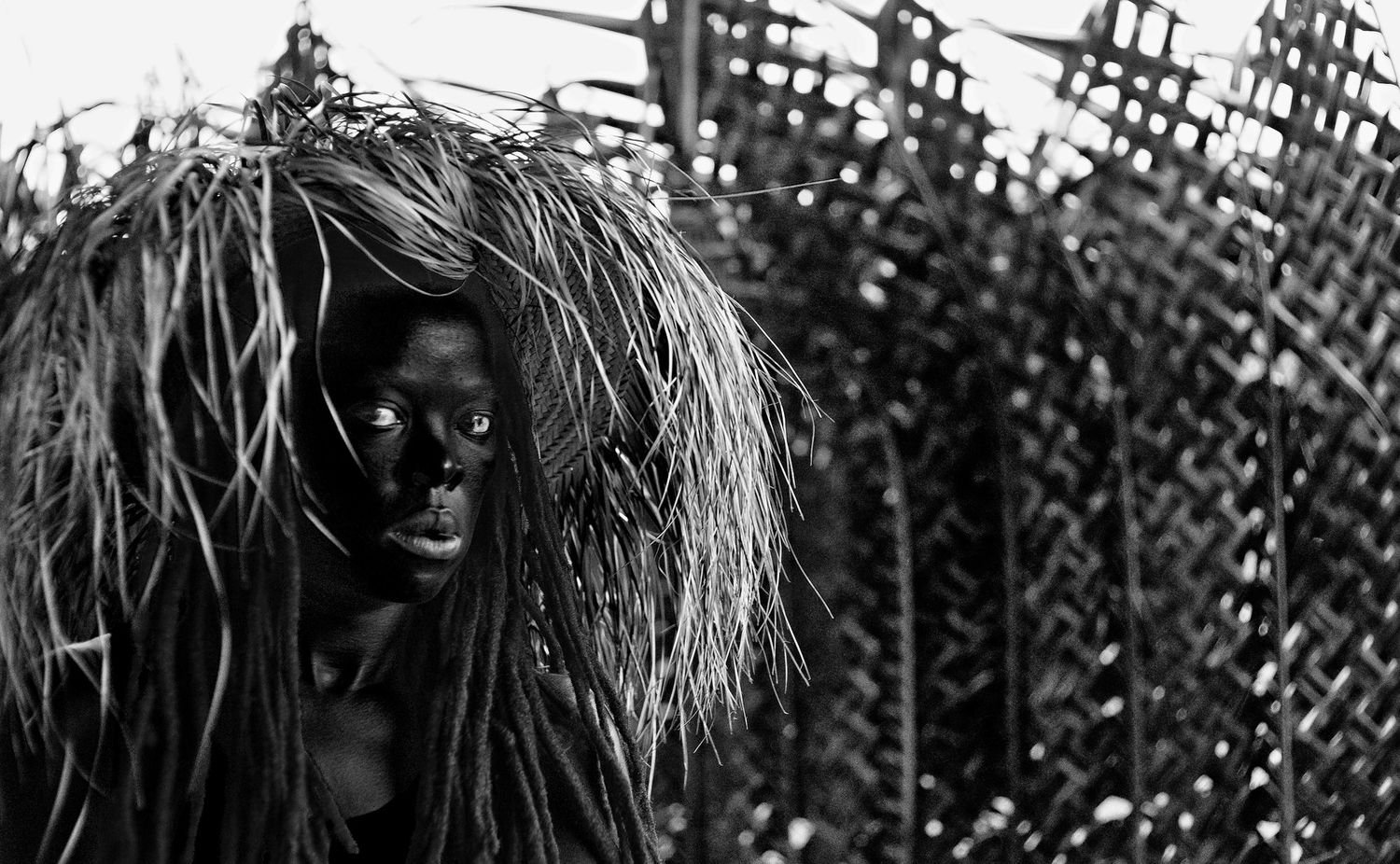 Looking at the image below, we at first see only decorative clothing and adornments. On closer inspection, however, the jagged objects crowning her head come into focus: they are clothespins. The elaborate, woven fabric on her body is, in reality, a doormat. Here, and across this bold new work, Muholi knows what we expect—and intentionally topples our predictions at every turn.