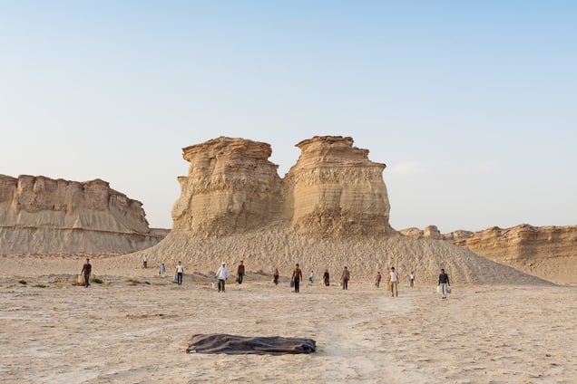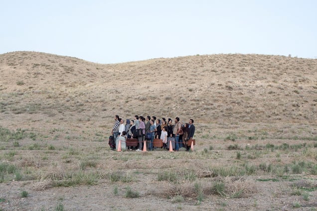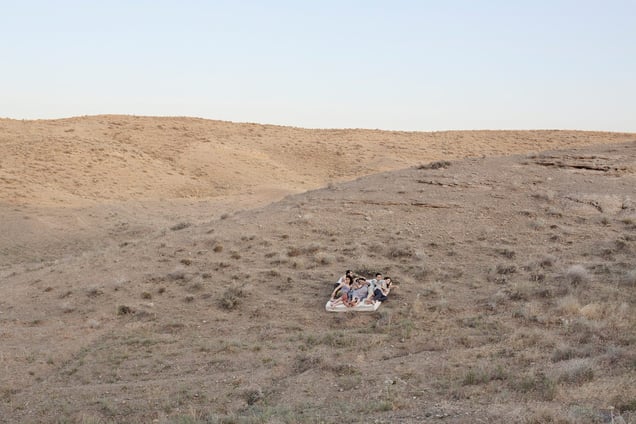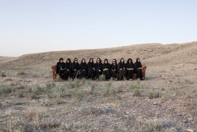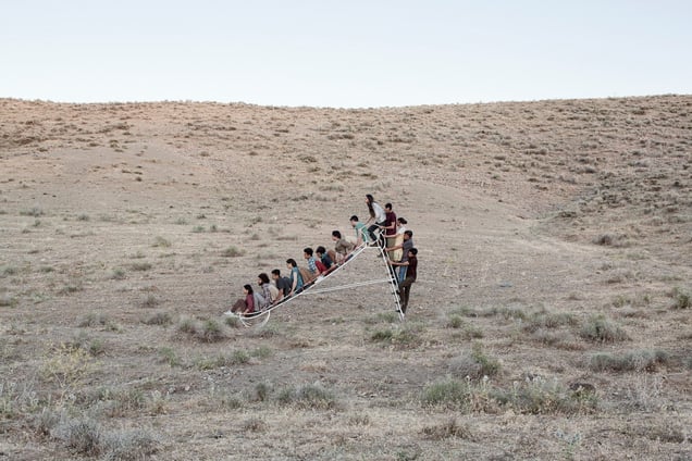 Any form of narrative tends to find expression in language. In Dashti’s Iran, however, the relationship between people is not one of language but one of the body. A group of people in a ditch quietly raise their hands in objection. Another group celebrates a wedding on a carpet that is not a flying carpet. A group of alienated women mourn silently. Young people lie on a mattress, waiting for something to happen. Others seem trapped on a slide. A group, younger still, sits in tub, perhaps waiting to be cleansed by the sunlight. A gathering seems ready for a journey. They look prepared but not hopeful. Soldiers play war-games on the edge of the border-less.