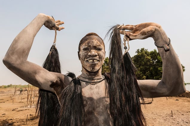 On the banks of the Nile, just north of the South Sudanese capital of Juba, dawn breaks on a Mundari cattle camp and a young man begins his morning ablutions. After cleaning his teeth with a stick, he lowers his head under a urinating cow, tethered to a post nearby. His impromptu shower will ward off infection and has the added benefit of dyeing his hair orange.