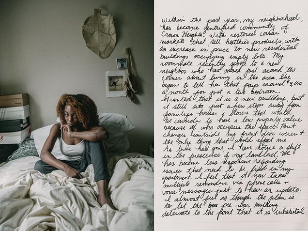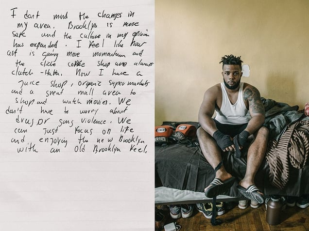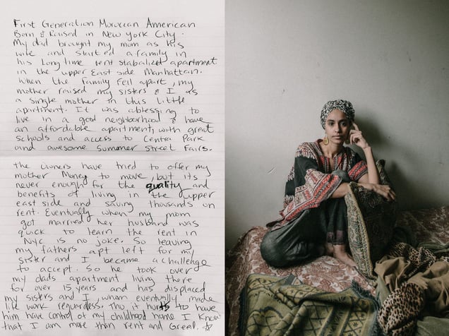 The Original New Yorkers is an ongoing portrait series of New York natives who have been affected by gentrification. Subjects are shot in their homes or workplaces and asked to submit a handwritten note, either depicting the way gentrification has affected them personally or an “open letter” addressing newcomers to New York City. The unedited note is then positioned next to the portrait, in diptych format.