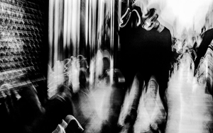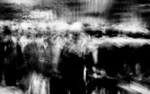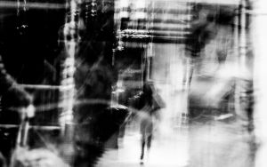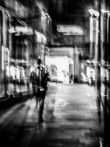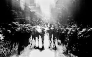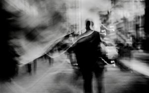 We see the world with a field of vision close to 180°, yet perhaps only 55° is in full colour and sharp. Our eyes scan repeatedly and our brain completes the scene. This means we are not fully conscious of the majority of what we see – it is peripheral to our awareness. But what if we were aware, what if the movement in the corner of our eyes became central. An indistinct world where colour fades to monochrome, and we have a heightened sense of motion.